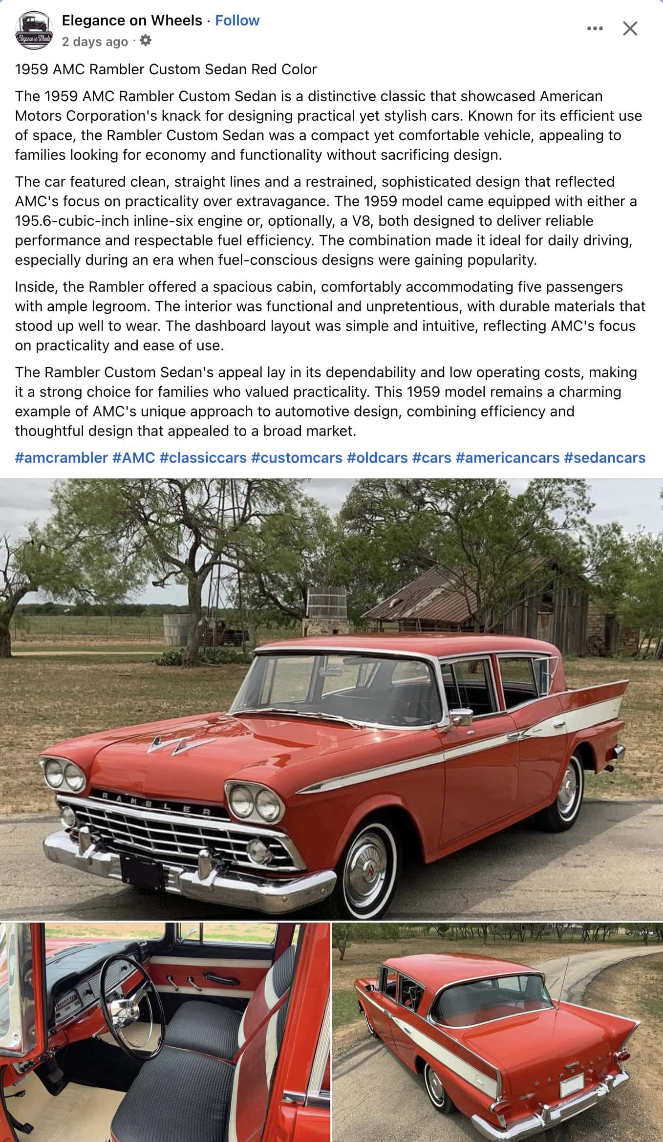 1959 AMC Rambler Custom Sedan FB December 6, 2024 Posted in Nash Miscellaneous Leave a Comment Cancel ReplyYou must be logged in to post a comment.