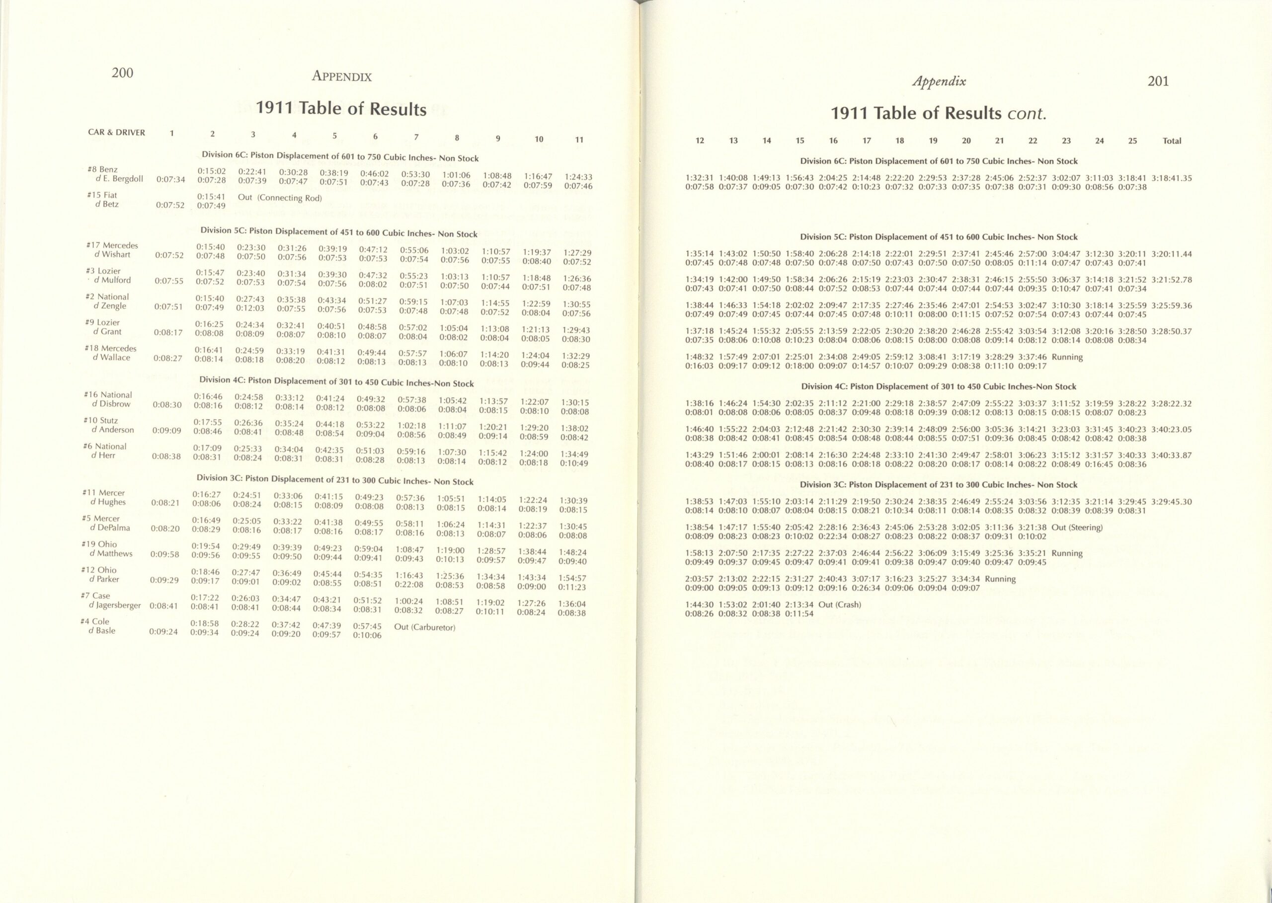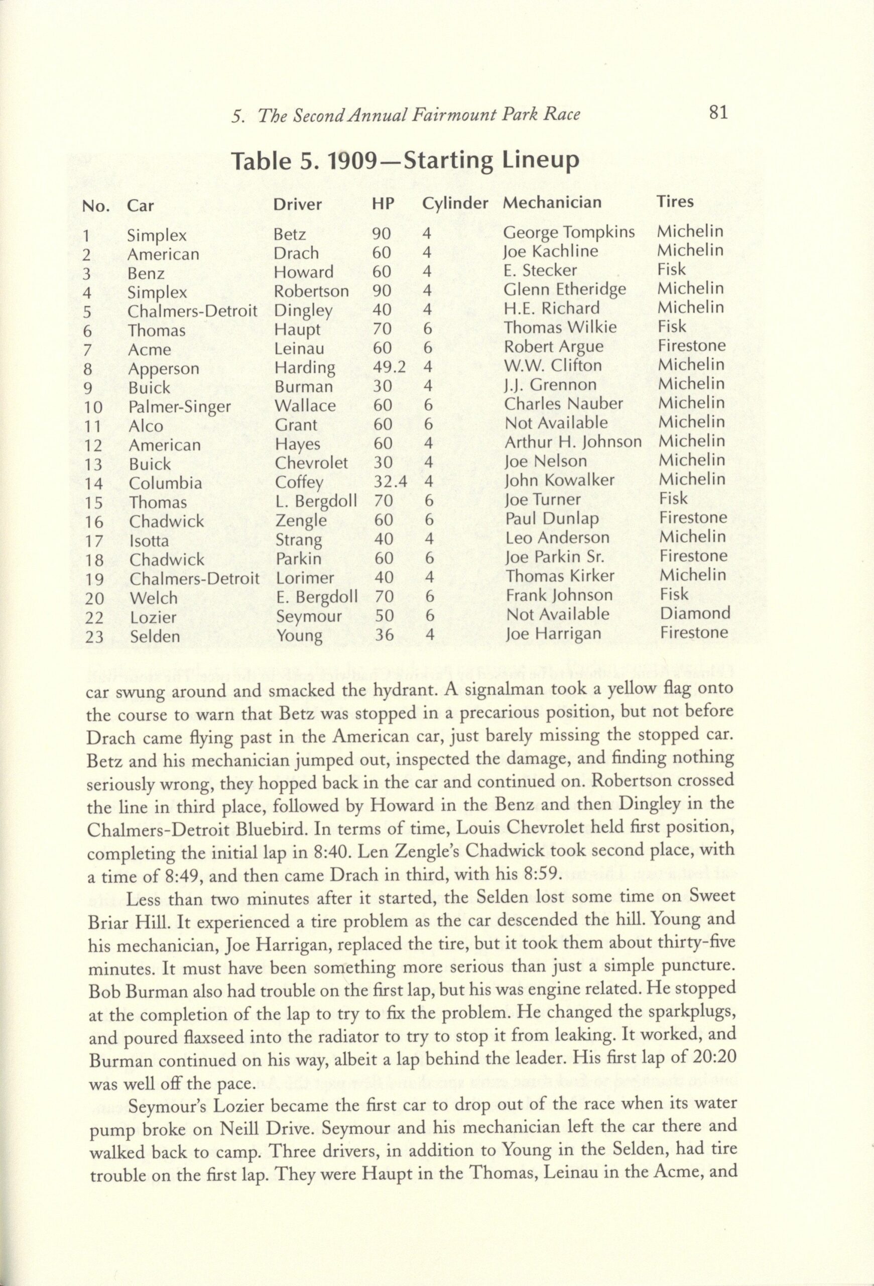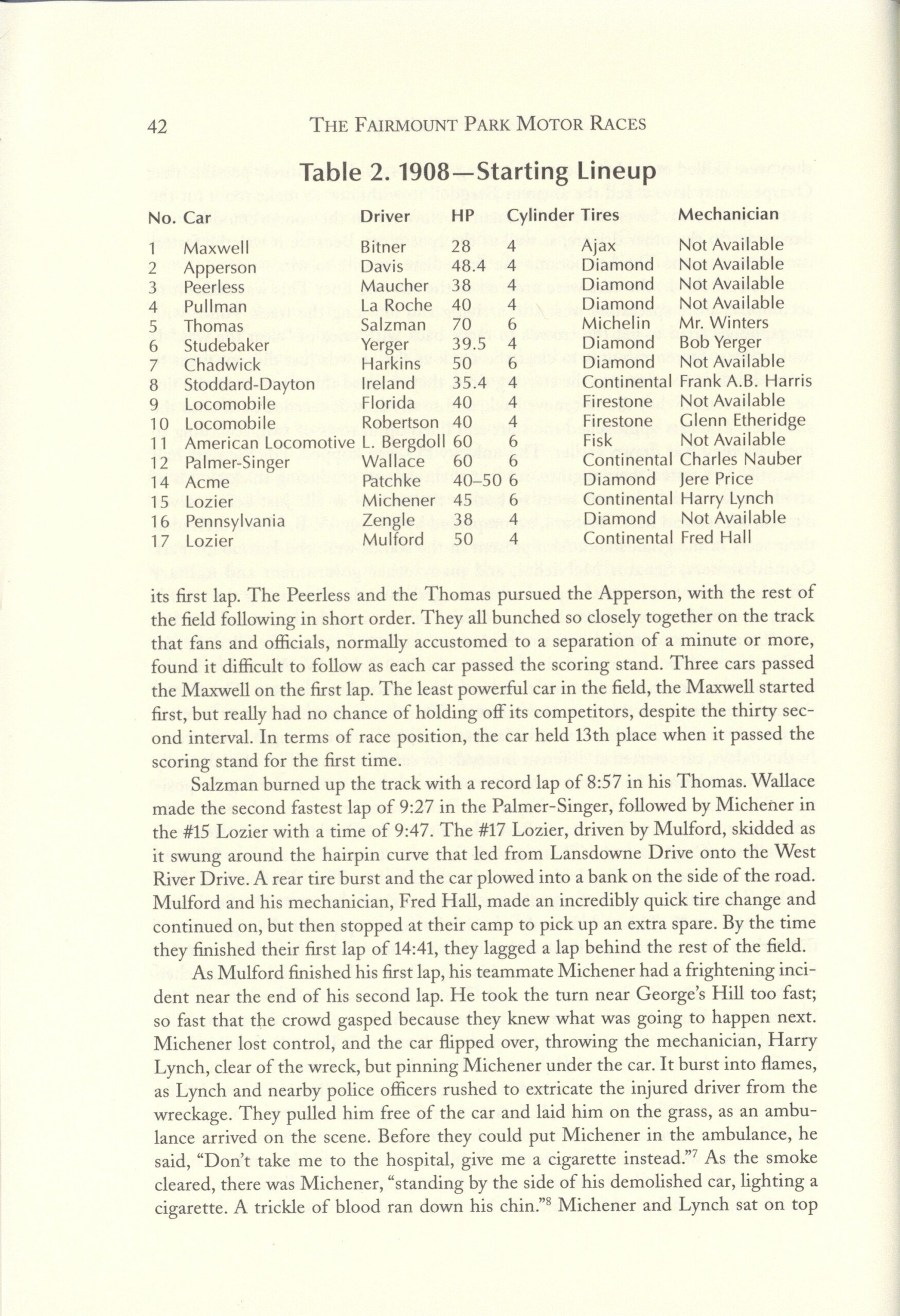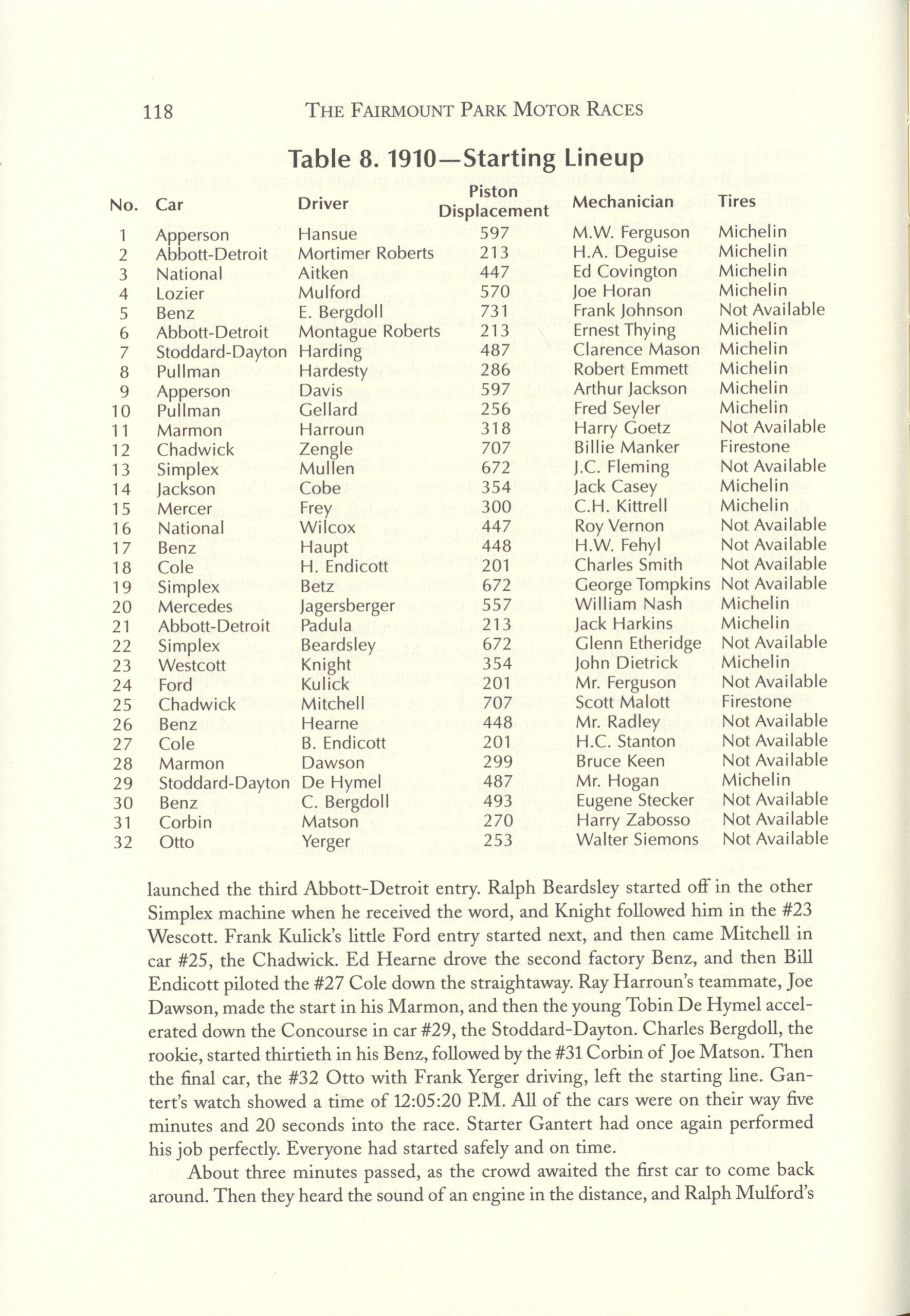 1910 Fairmount Park Races Table 8. 1910 Starting Lineup THE FAIRMOUNT PARK MOTOR RACES 1908-1911 BY Michael J. Senega 7″×10″ page 118