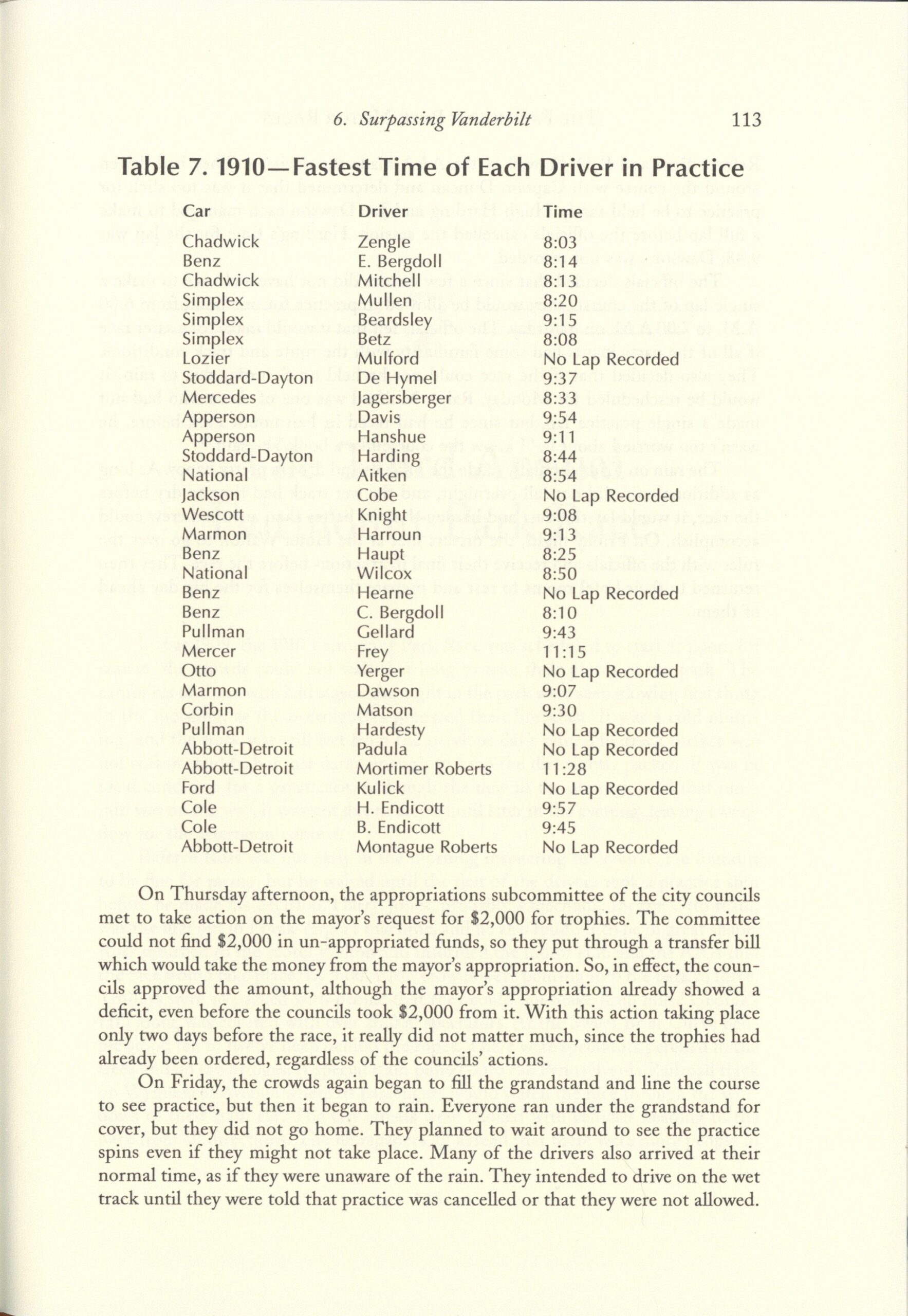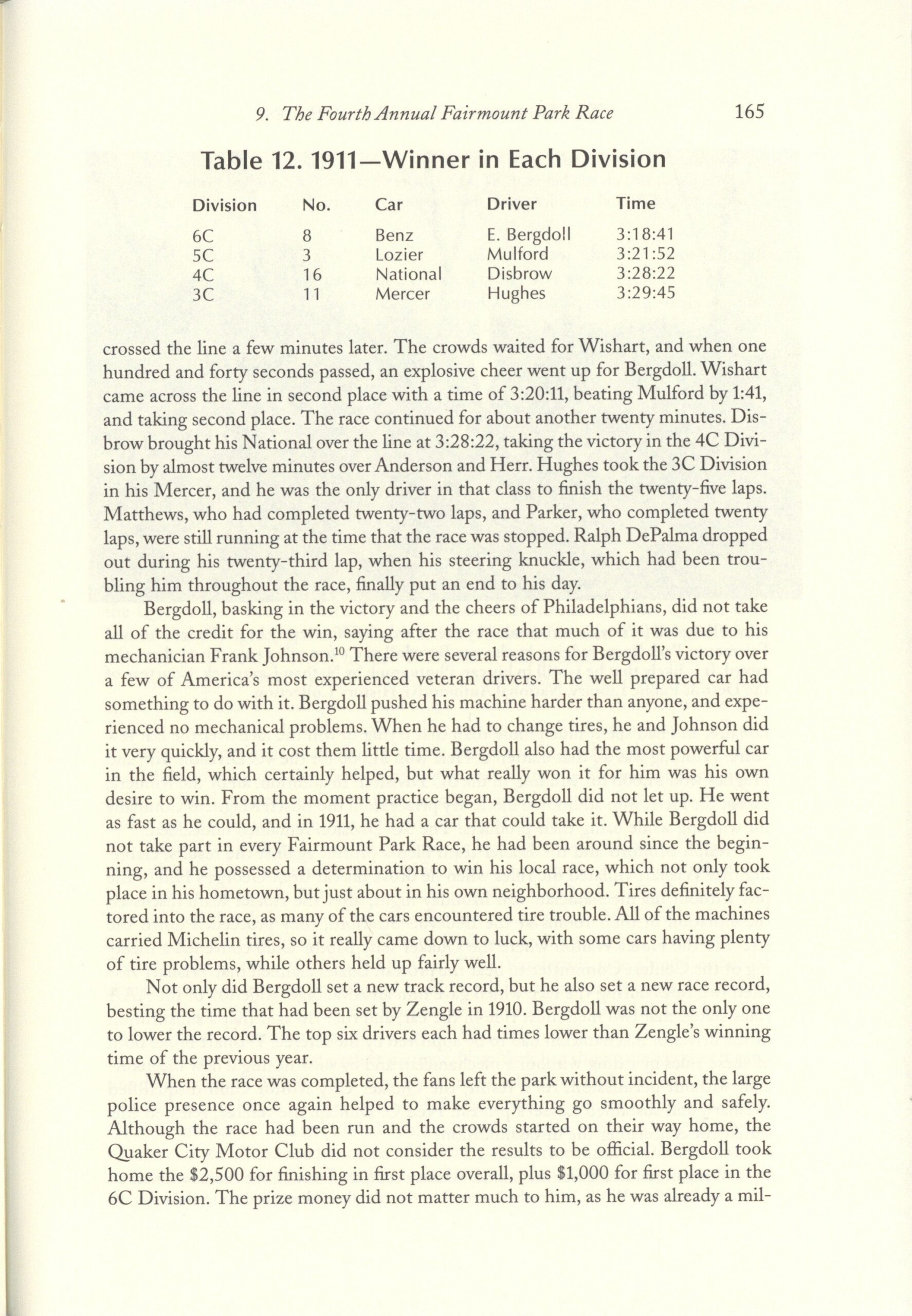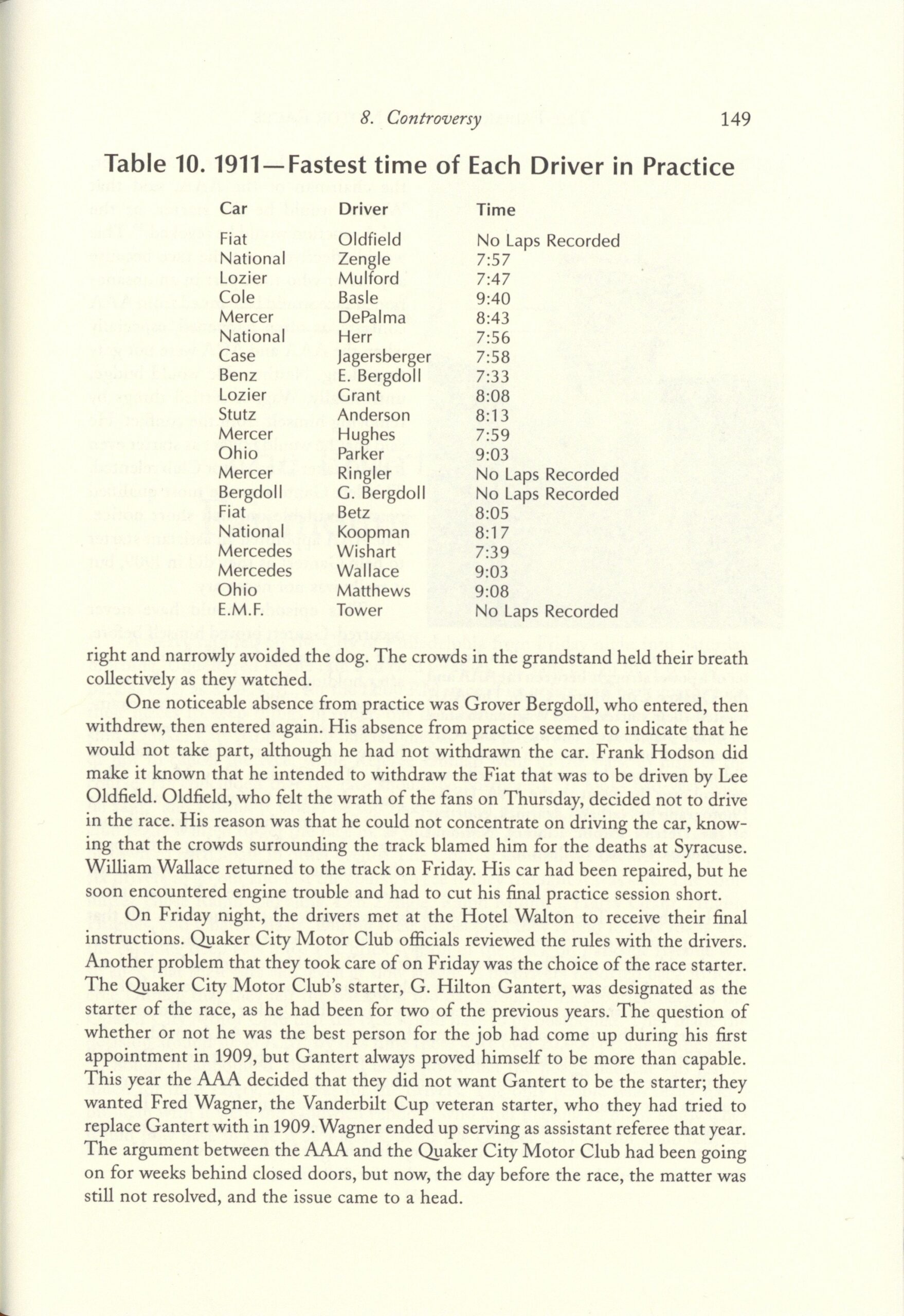 1911 Fairmount Park Races Table 10. 1911 Fastest time of Each Driver in Practice THE FAIRMOUNT PARK MOTOR RACES 1908-1911 BY Michael J. Senega 7″×10″ page 149