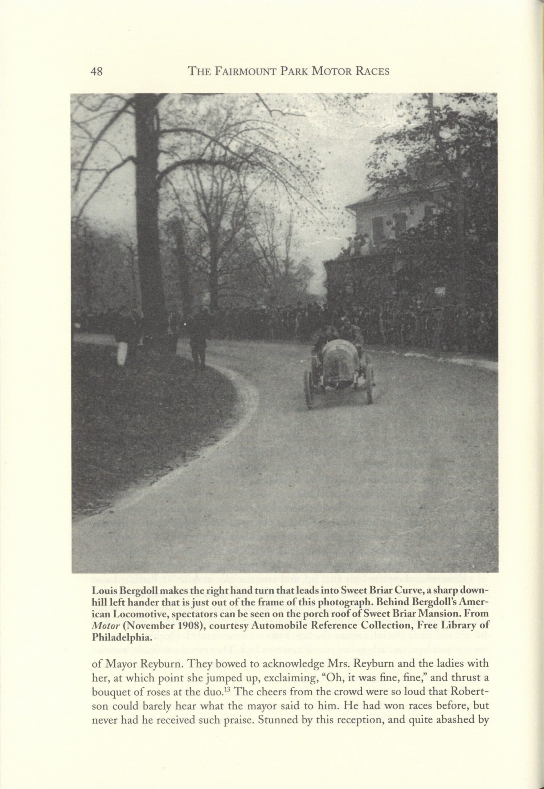 1908 Fairmount Park Races Louis Bergdoll makes the right hand turn that leads into Sweet Briar Curve photo THE FAIRMOUNT PARK MOTOR RACES 1908-1911 BY Michael J. Senega 7″×10″ page 48