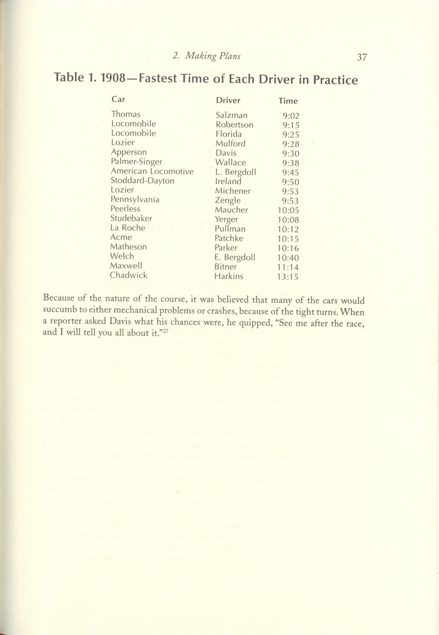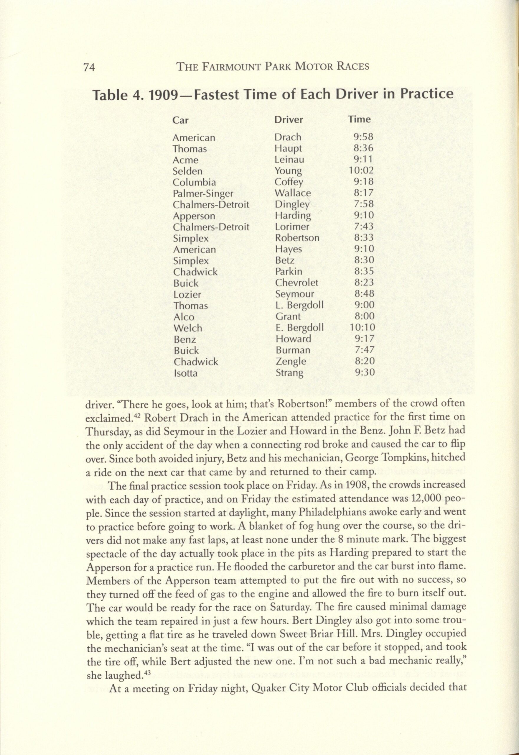 1909 Fairmount Park Races Table 1. 1909 Fastest time of Each Driver in Practice THE FAIRMOUNT PARK MOTOR RACES 1908-1911 BY Michael J. Senega 7″×10″ page 74