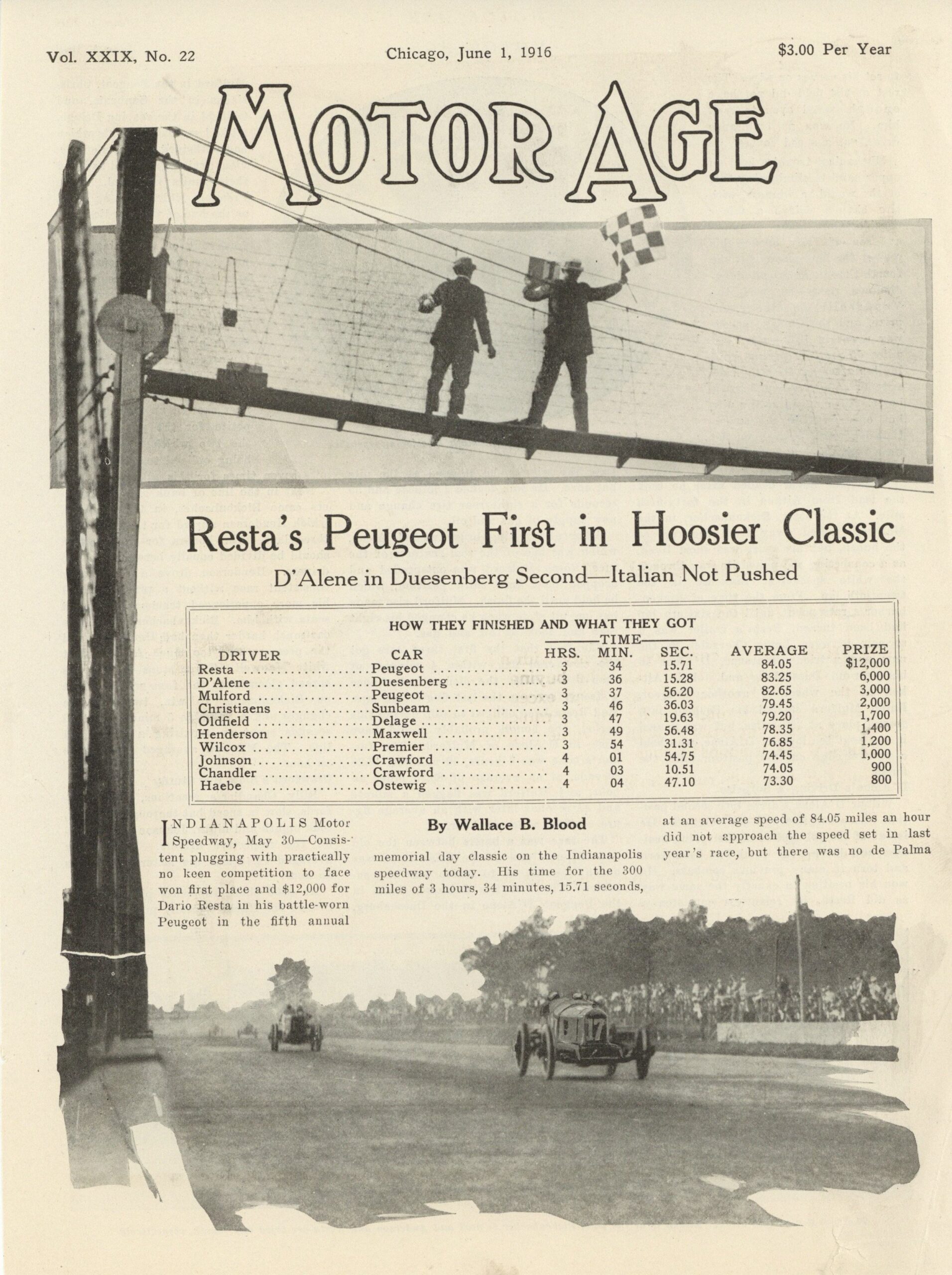 1916 6 1 Indy 500 Resta’s Peugeot First in Hoosier Classic by Wallace B. Blood article MOTOR AGE 8.25″×11.25″ page 06