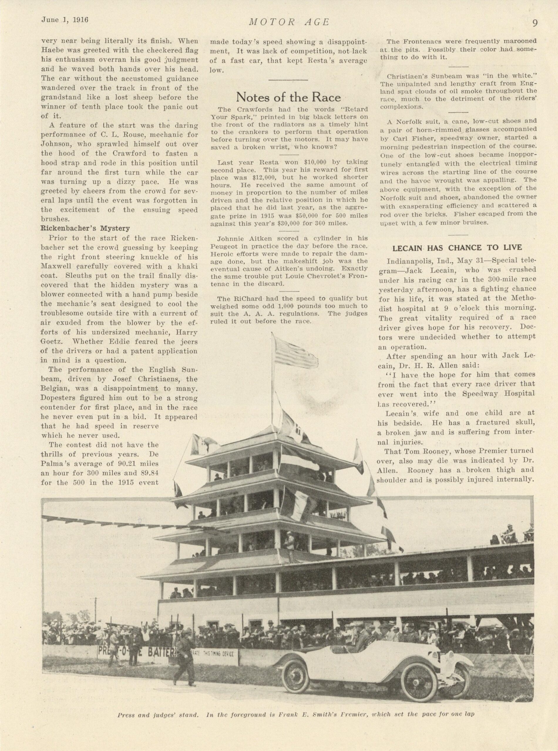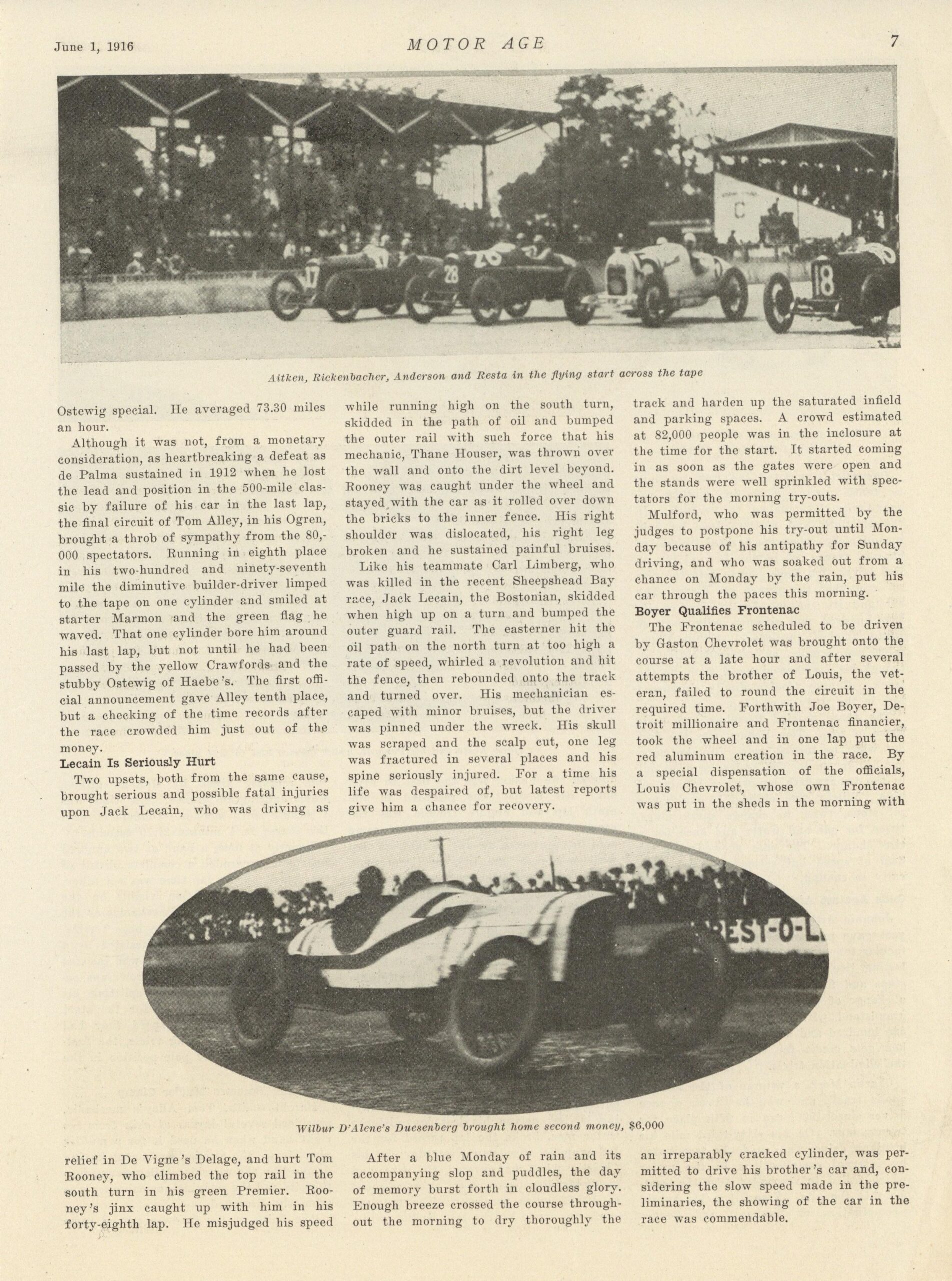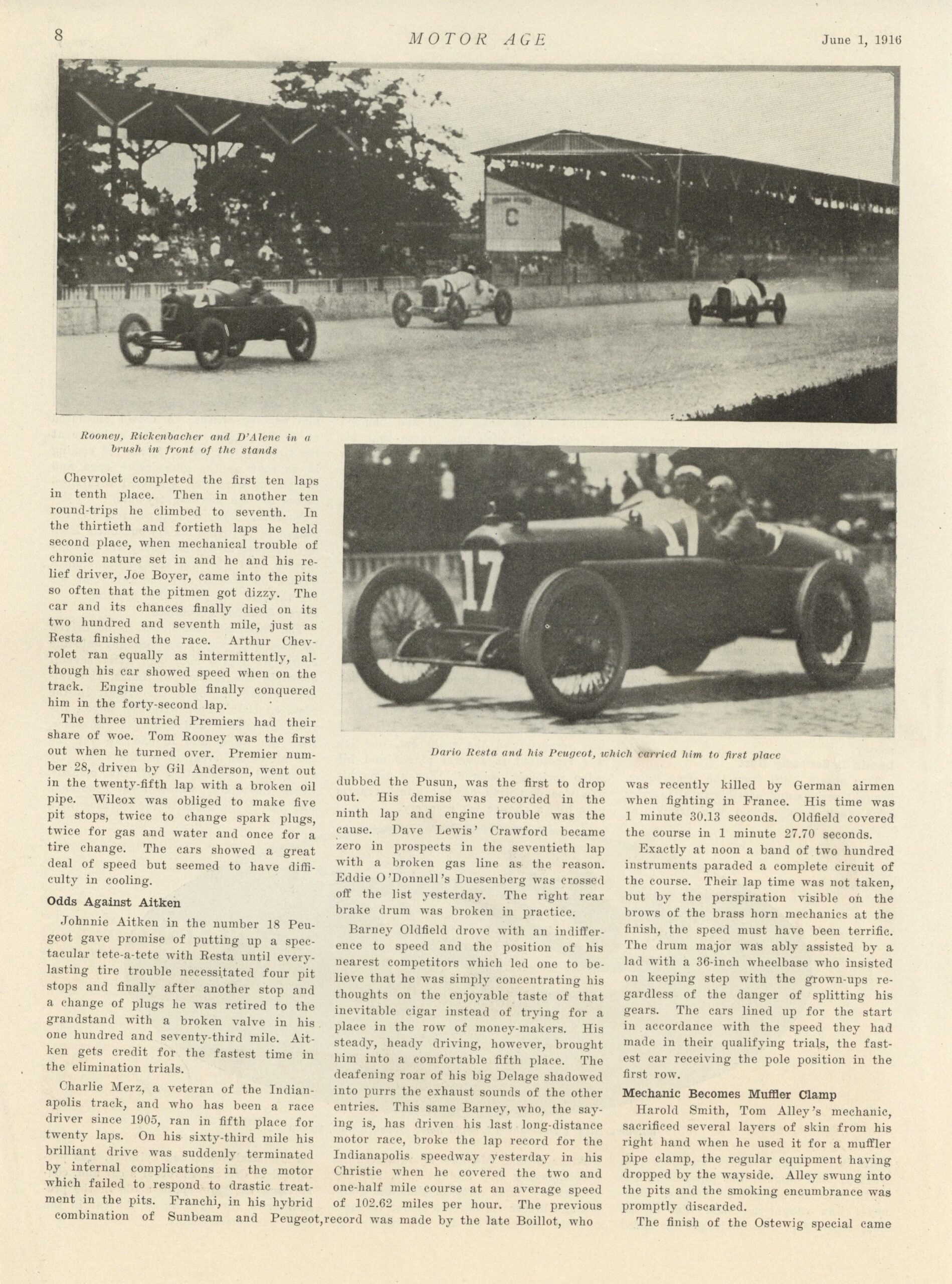 1916 6 1 Indy 500 Resta’s Peugeot First in Hoosier Classic by Wallace B. Blood article MOTOR AGE 8.25″×11.25″ page 07