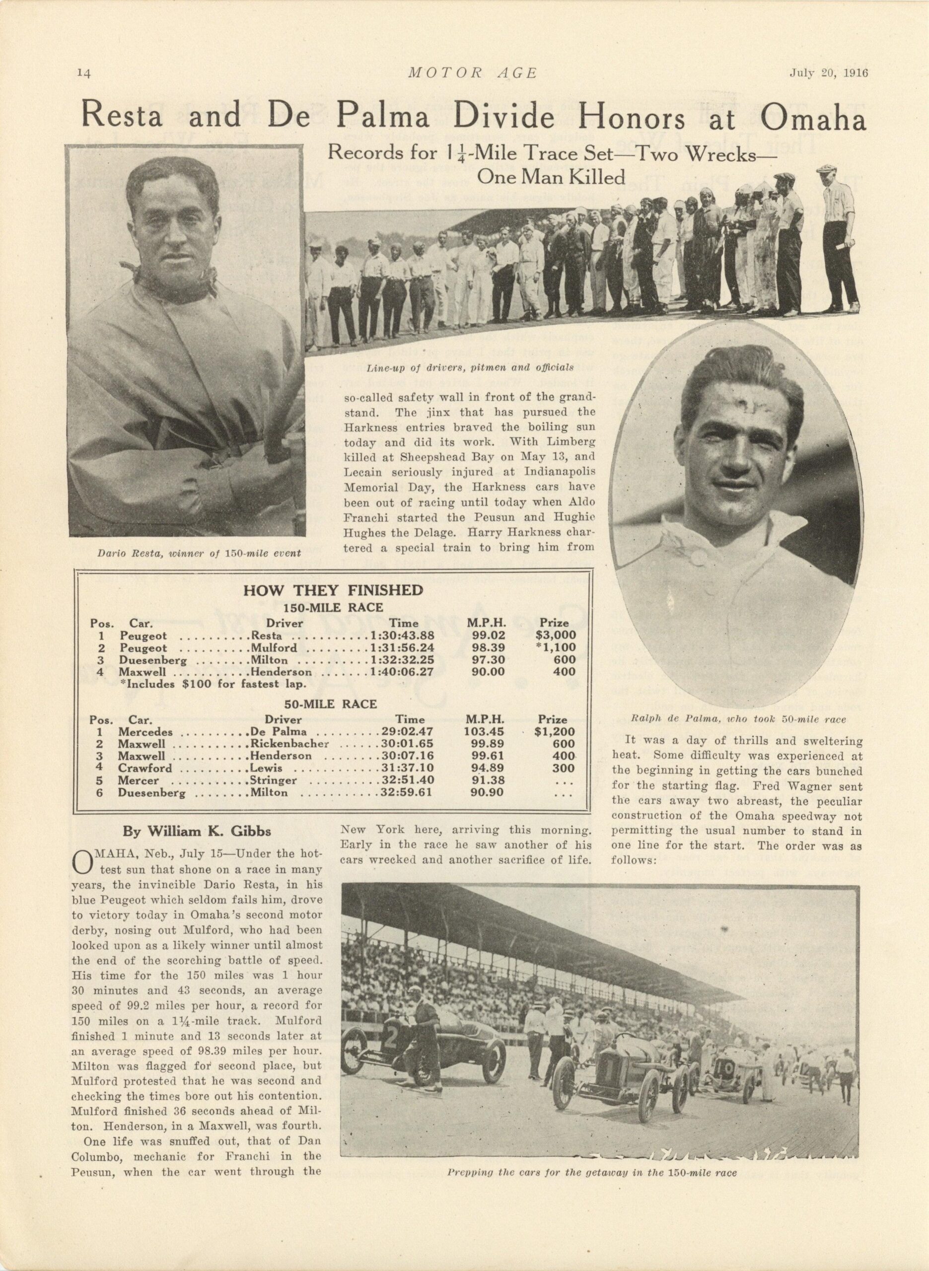 1916 7 20 Resta and De Palma Divide Honors at Omaha article MOTOR AGE 8.5″×12″ page 14