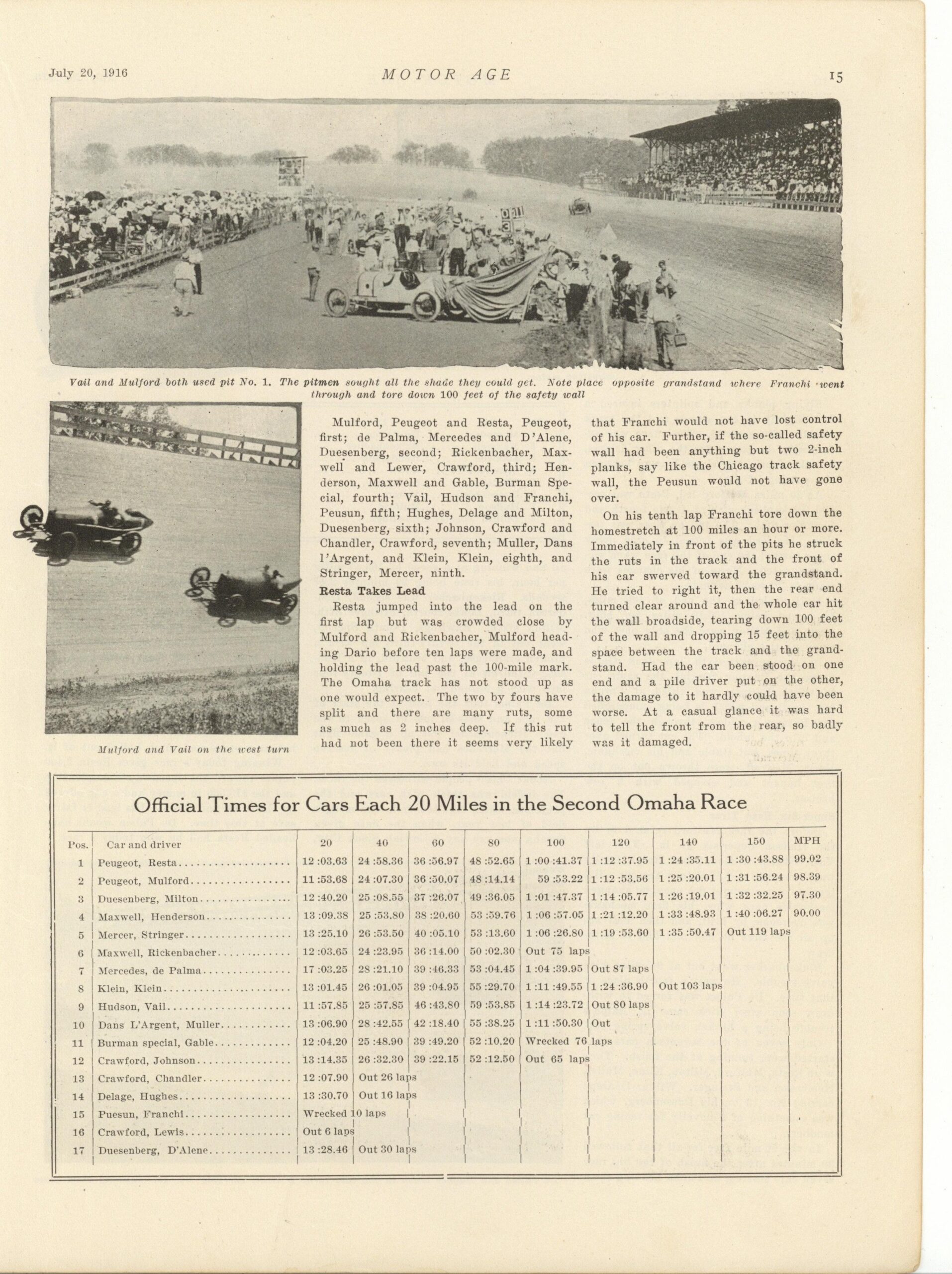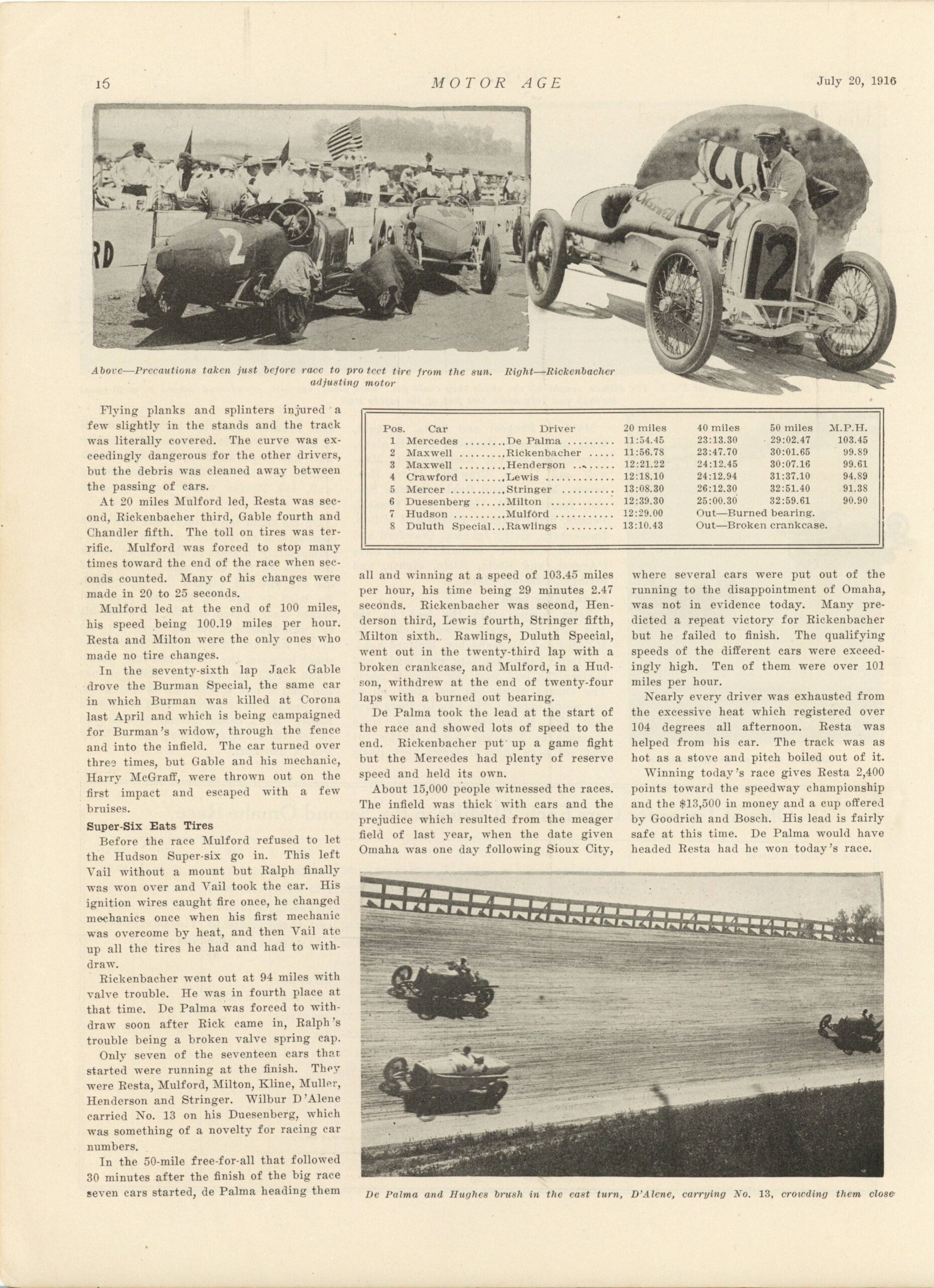 1916 7 20 Resta and De Palma Divide Honors at Omaha article MOTOR AGE 8.5″×12″ page 15