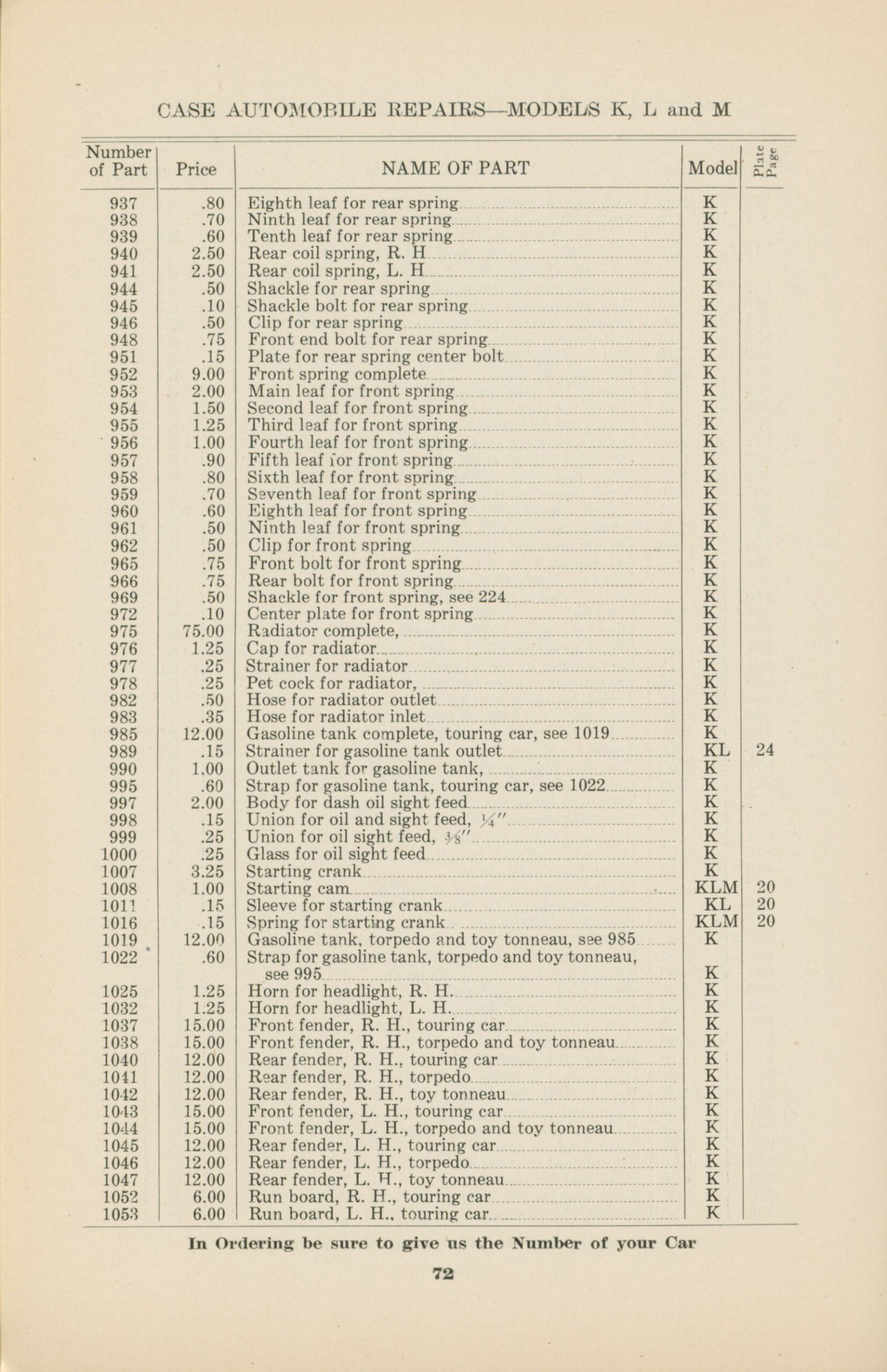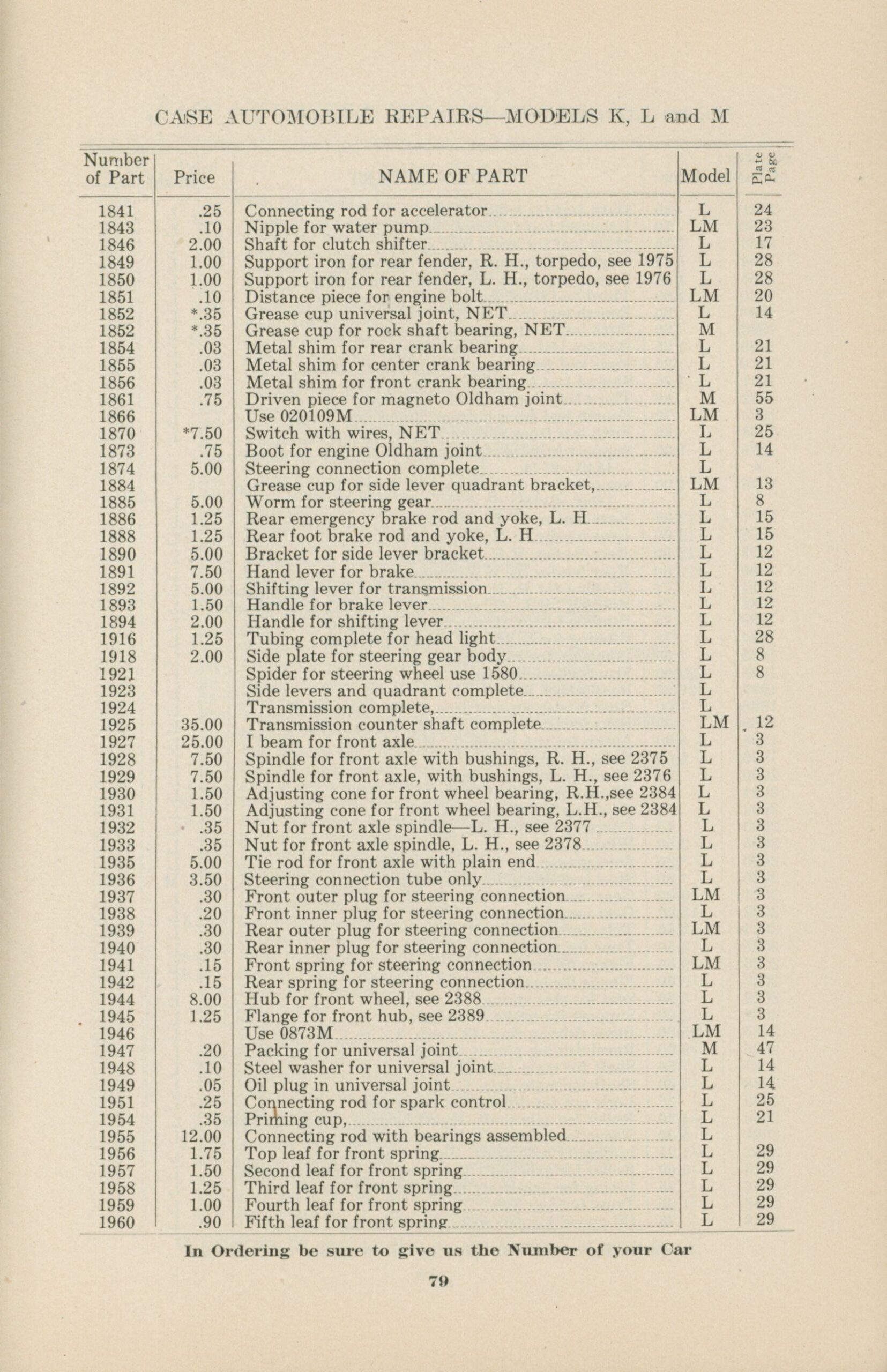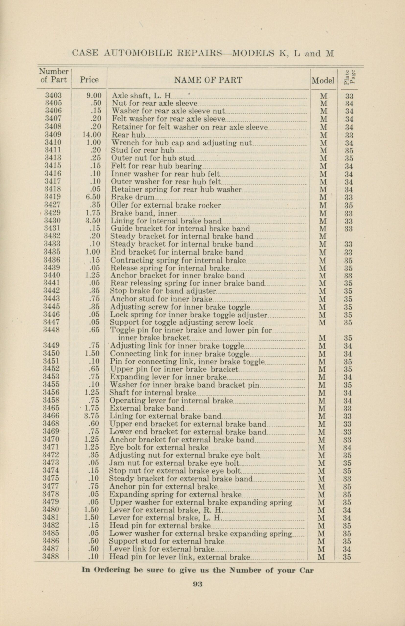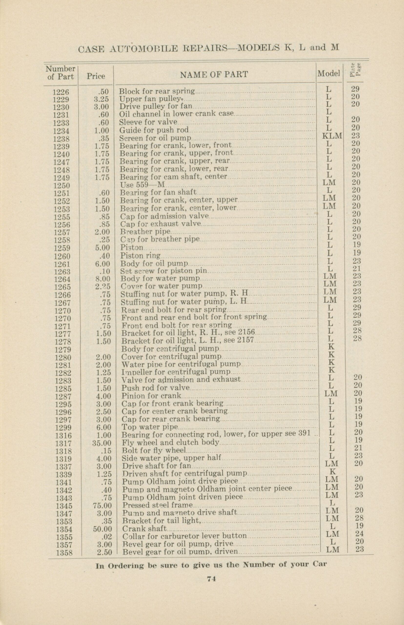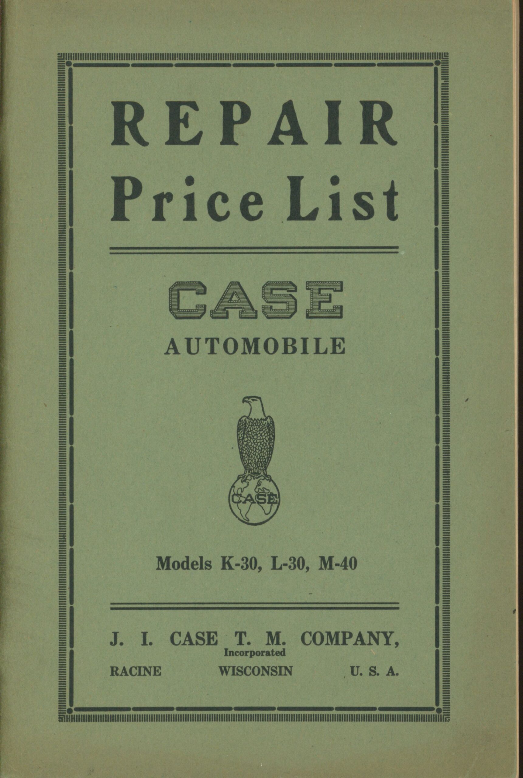 1912 CASE AUTOMOBILE REPAIR Price List Models K-30, L-30, M-40 AACA Library