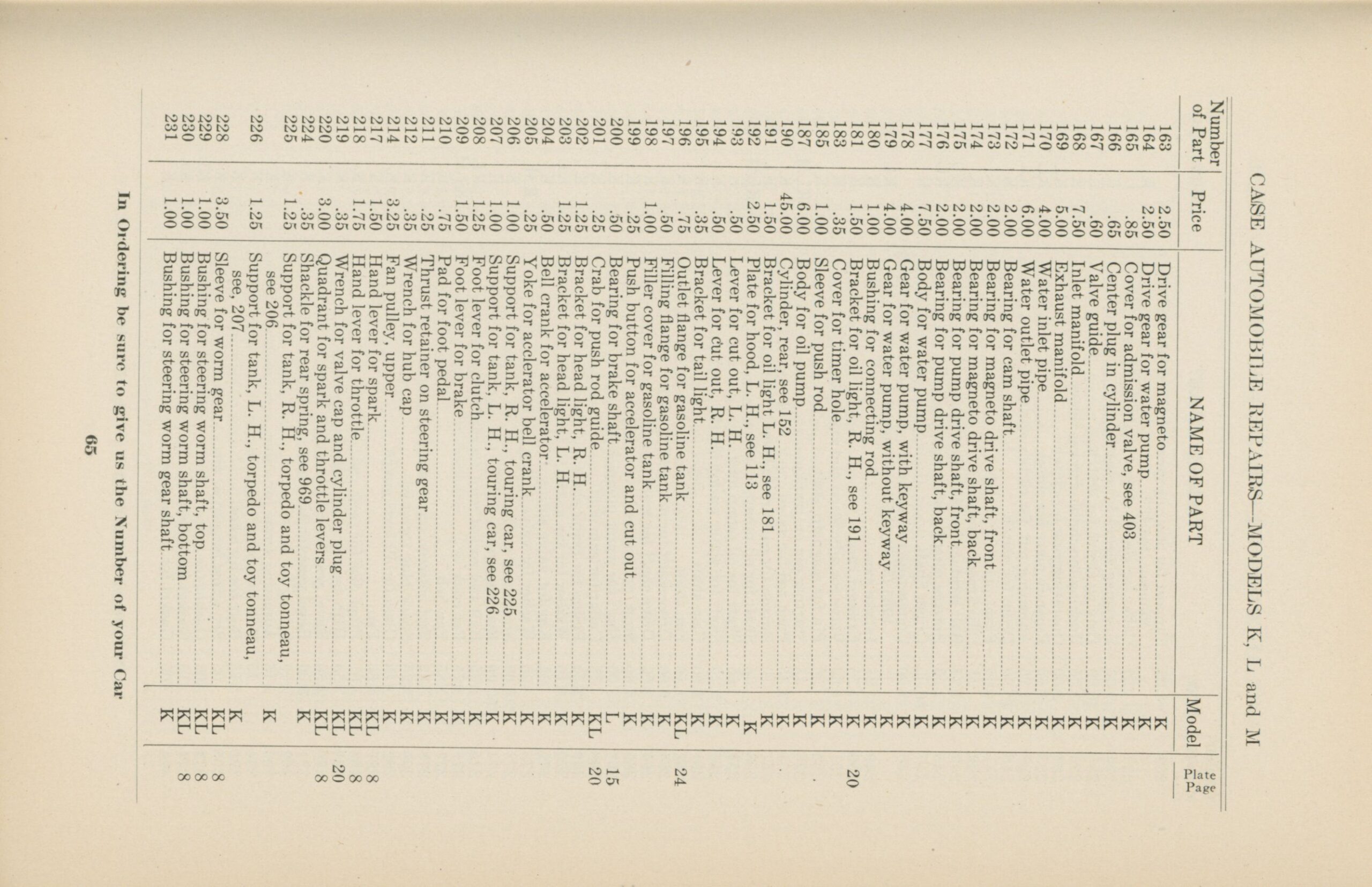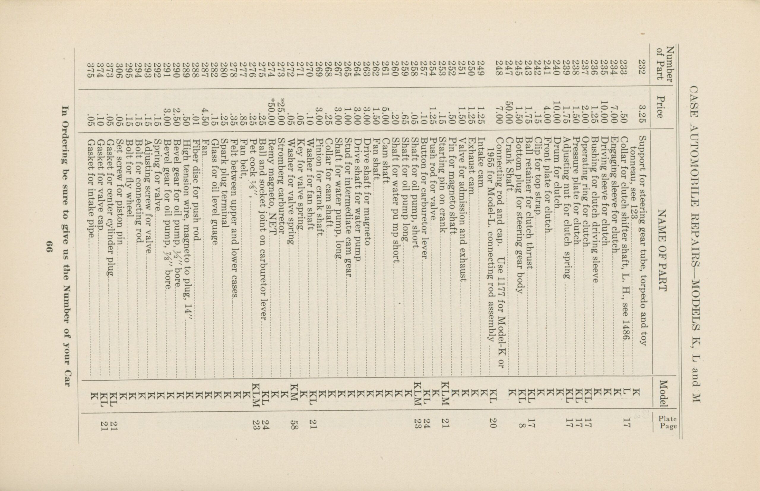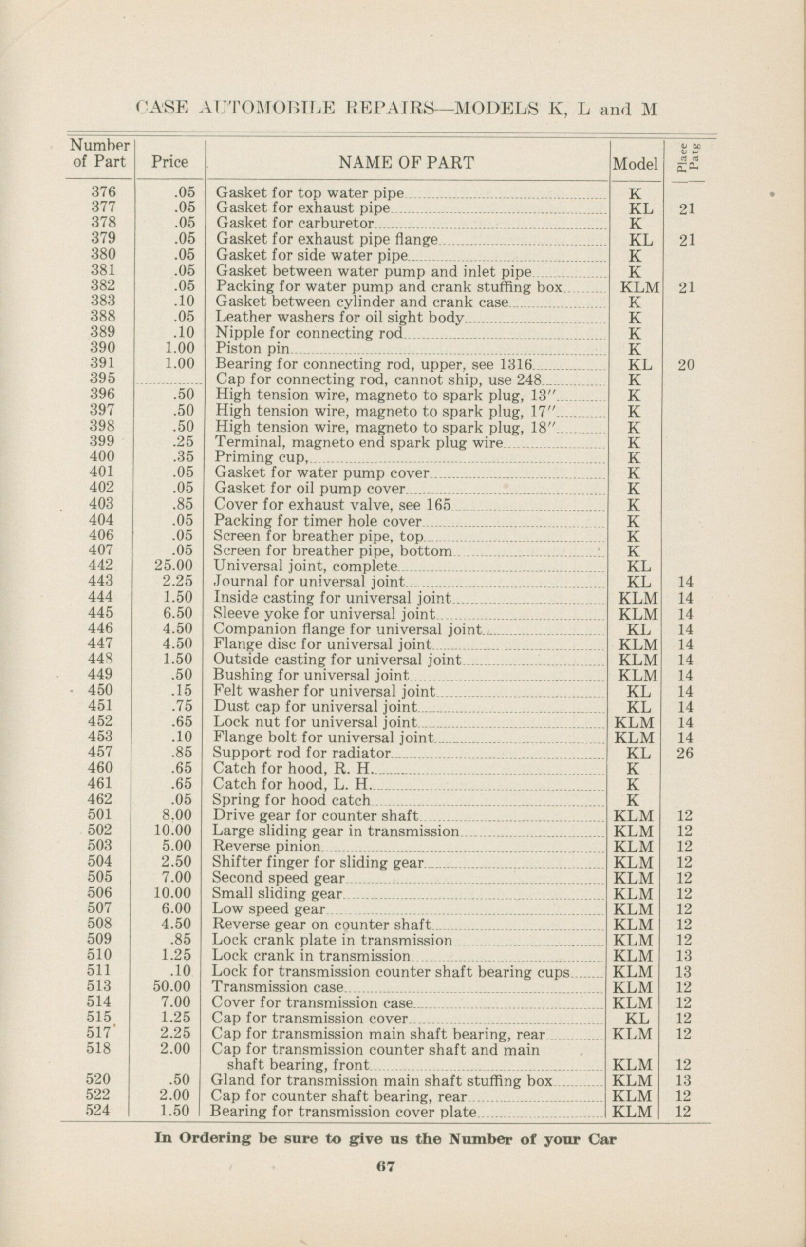1912 CASE AUTOMOBILE REPAIR Price List Models K-30, L-30, M-40 page 67