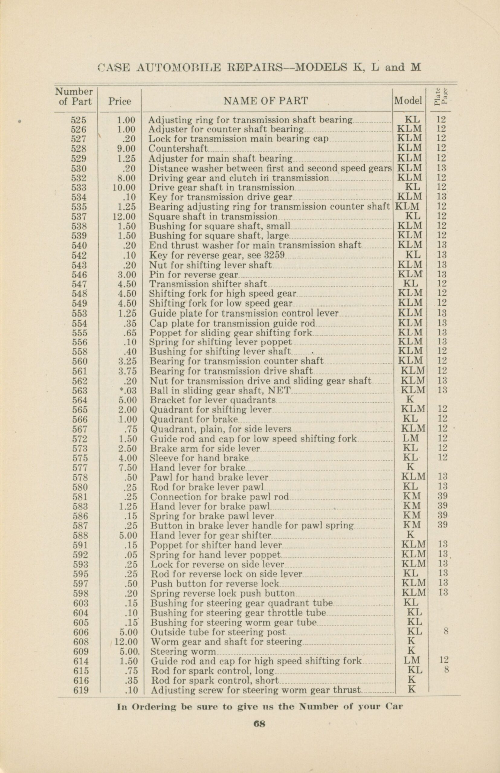 1912 CASE AUTOMOBILE REPAIR Price List Models K-30, L-30, M-40 page 68