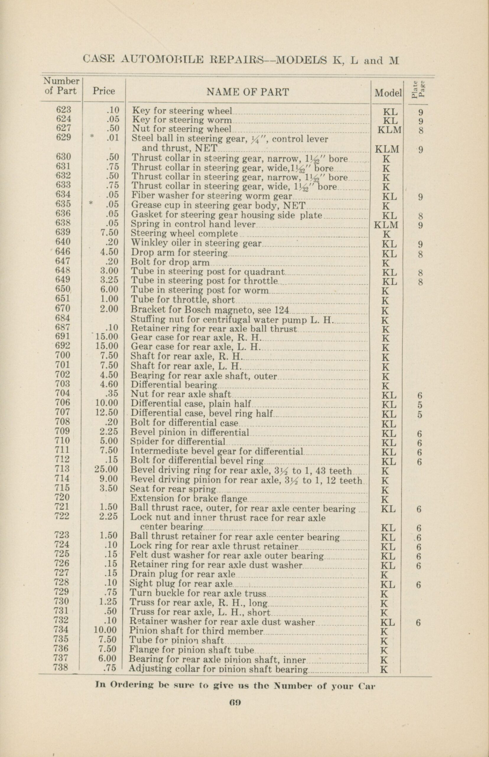 1912 CASE AUTOMOBILE REPAIR Price List Models K-30, L-30, M-40 page 69