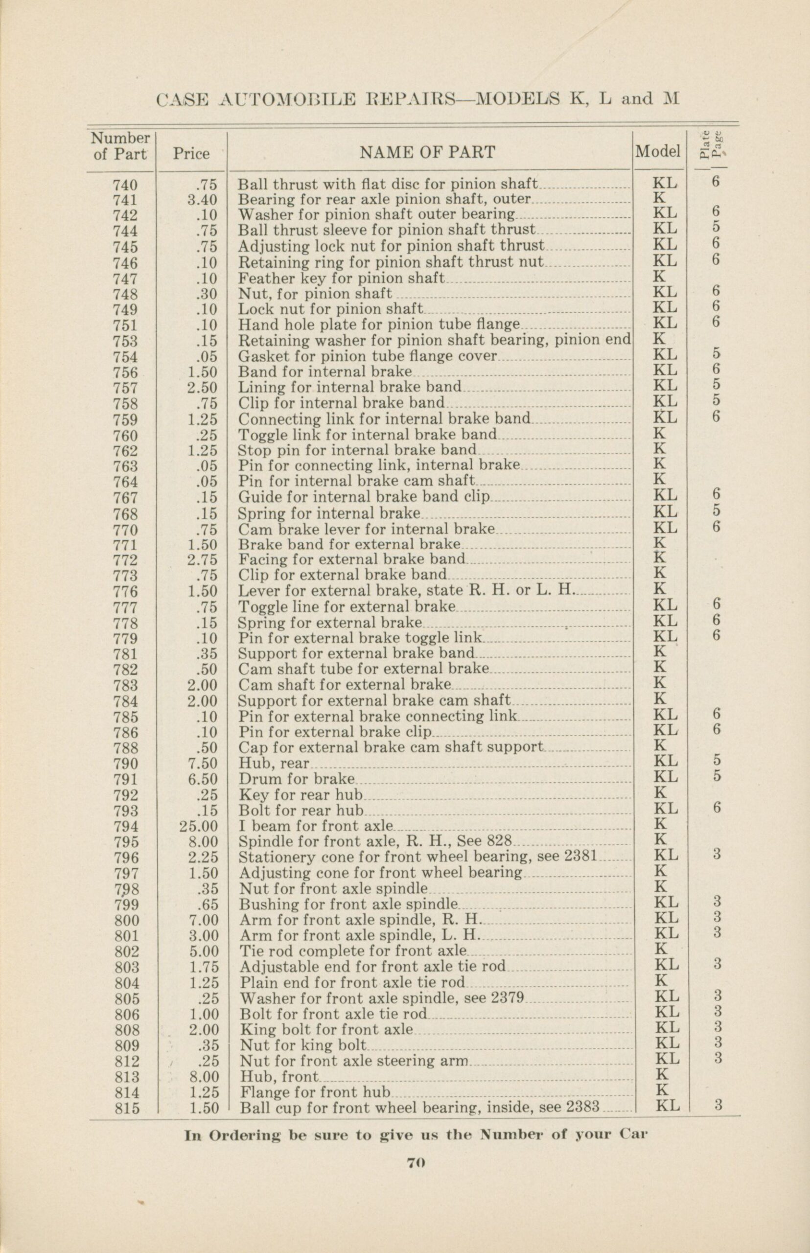 1912 CASE AUTOMOBILE REPAIR Price List Models K-30, L-30, M-40 page 70