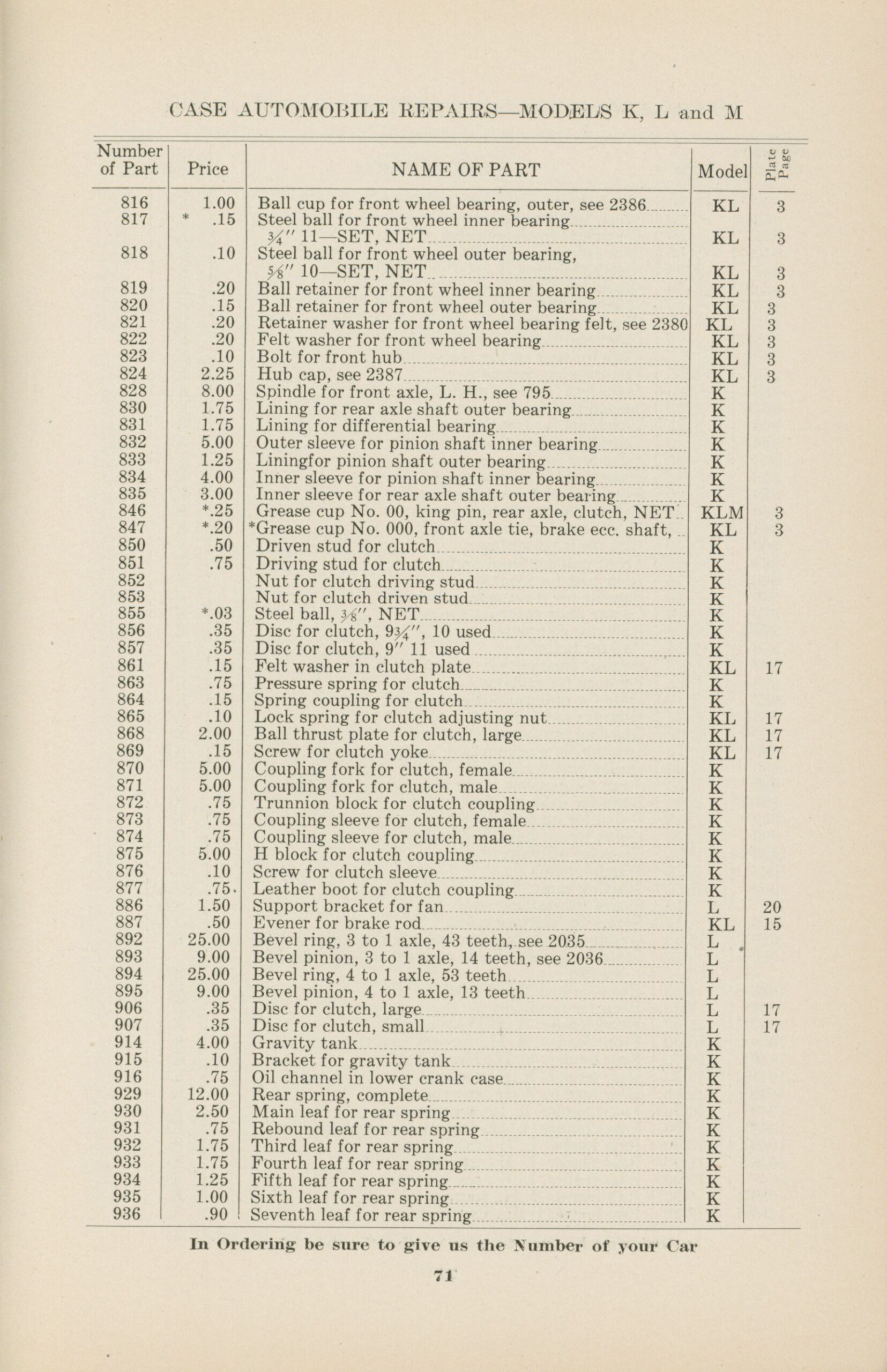 1912 CASE AUTOMOBILE REPAIR Price List Models K-30, L-30, M-40 page 71