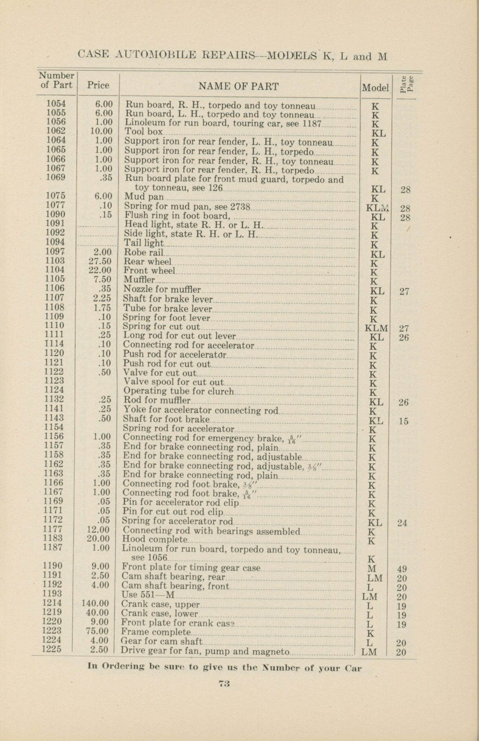 1912 CASE AUTOMOBILE REPAIR Price List Models K-30, L-30, M-40 page 73