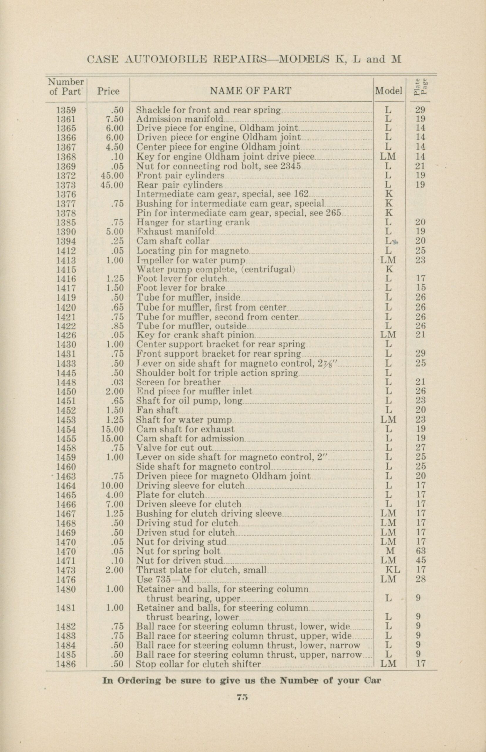 1912 CASE AUTOMOBILE REPAIR Price List Models K-30, L-30, M-40 page 75
