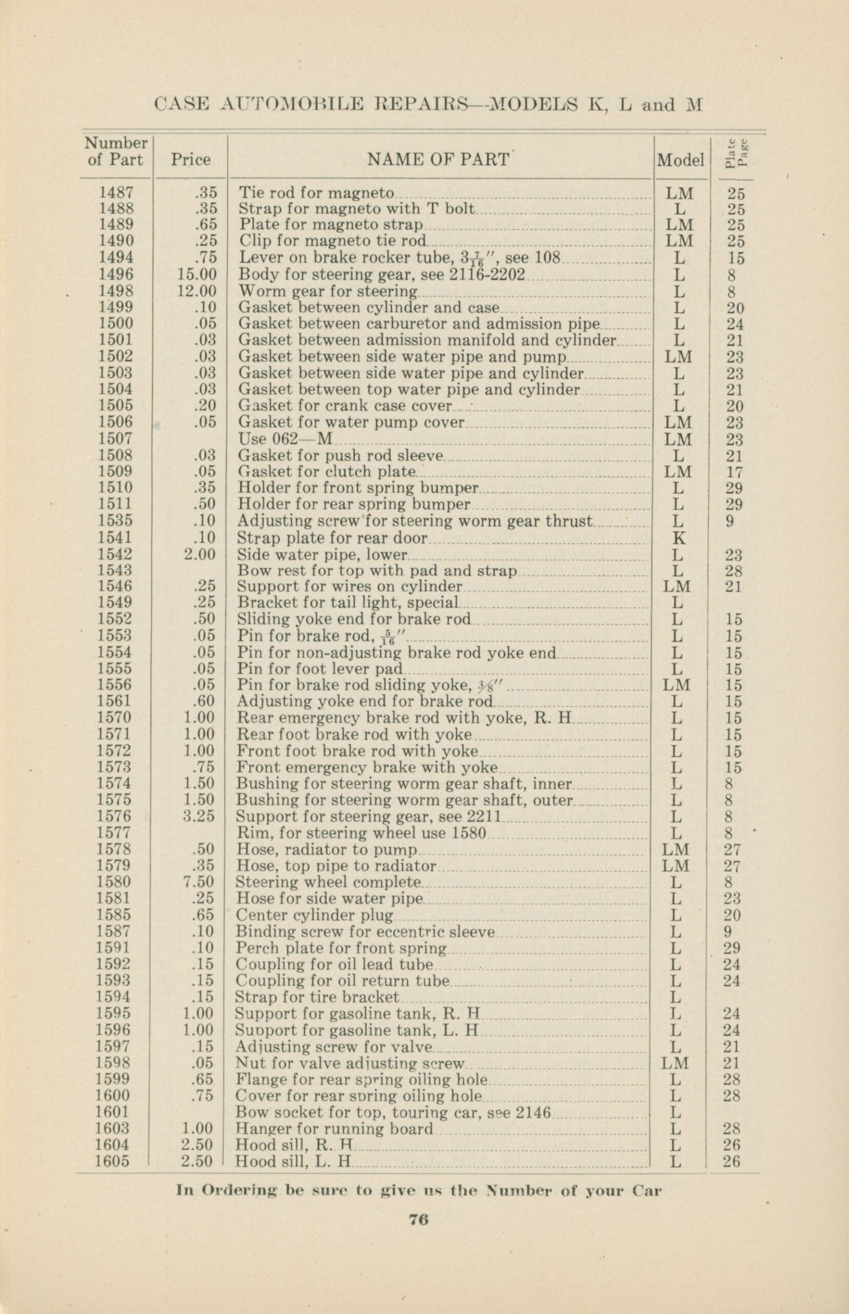 1912 CASE AUTOMOBILE REPAIR Price List Models K-30, L-30, M-40 page 76