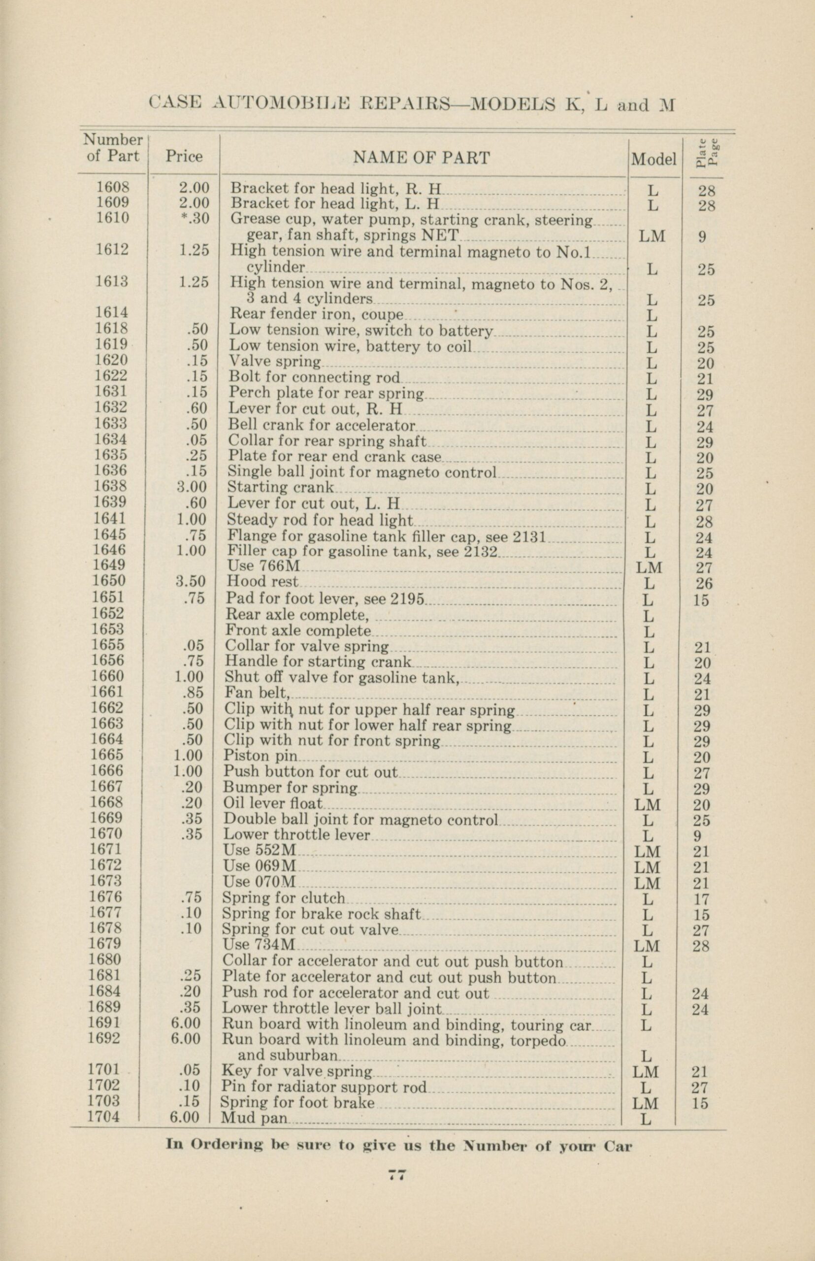 1912 CASE AUTOMOBILE REPAIR Price List Models K-30, L-30, M-40 page 77