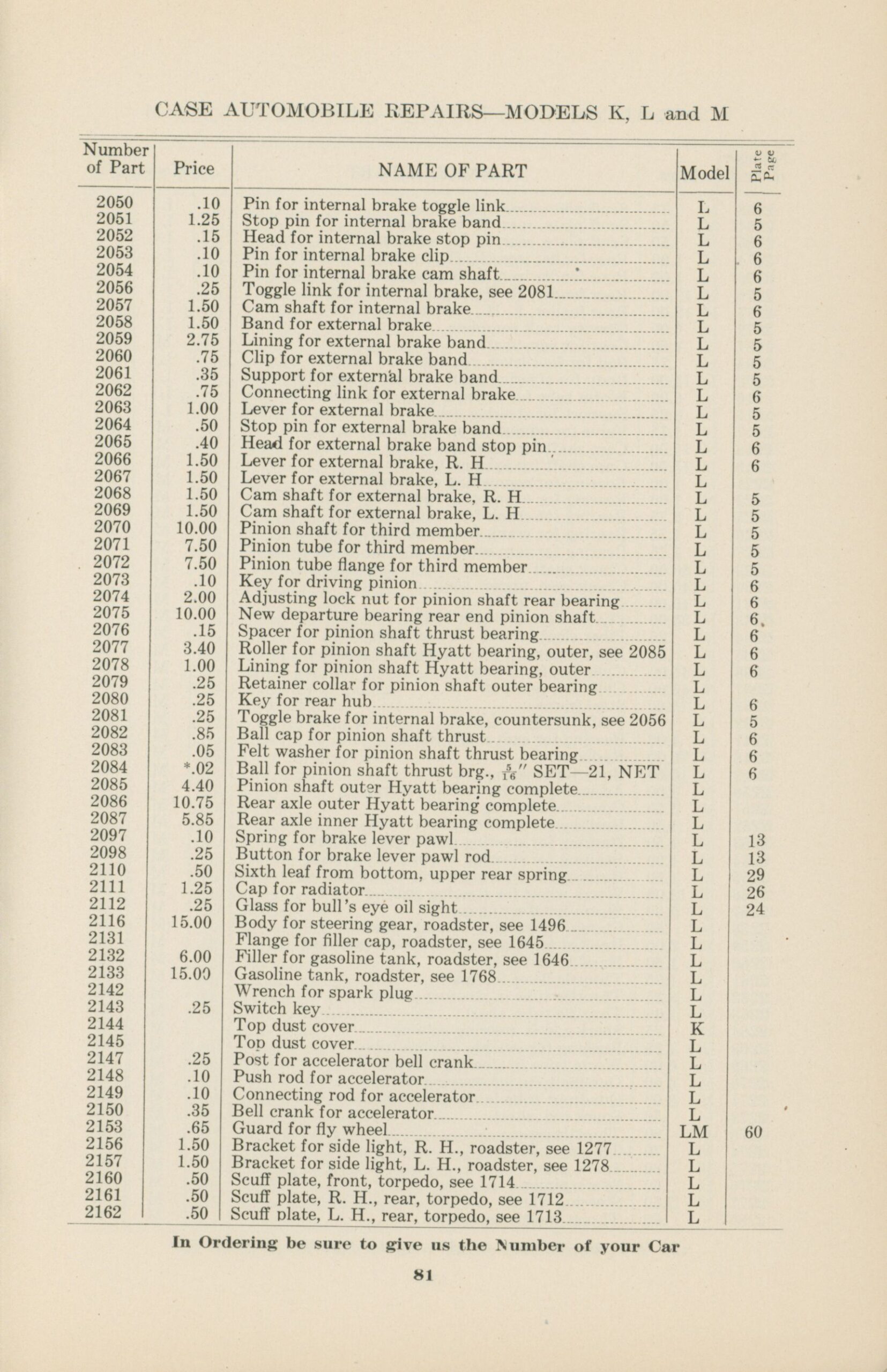 1912 CASE AUTOMOBILE REPAIR Price List Models K-30, L-30, M-40 page 51
