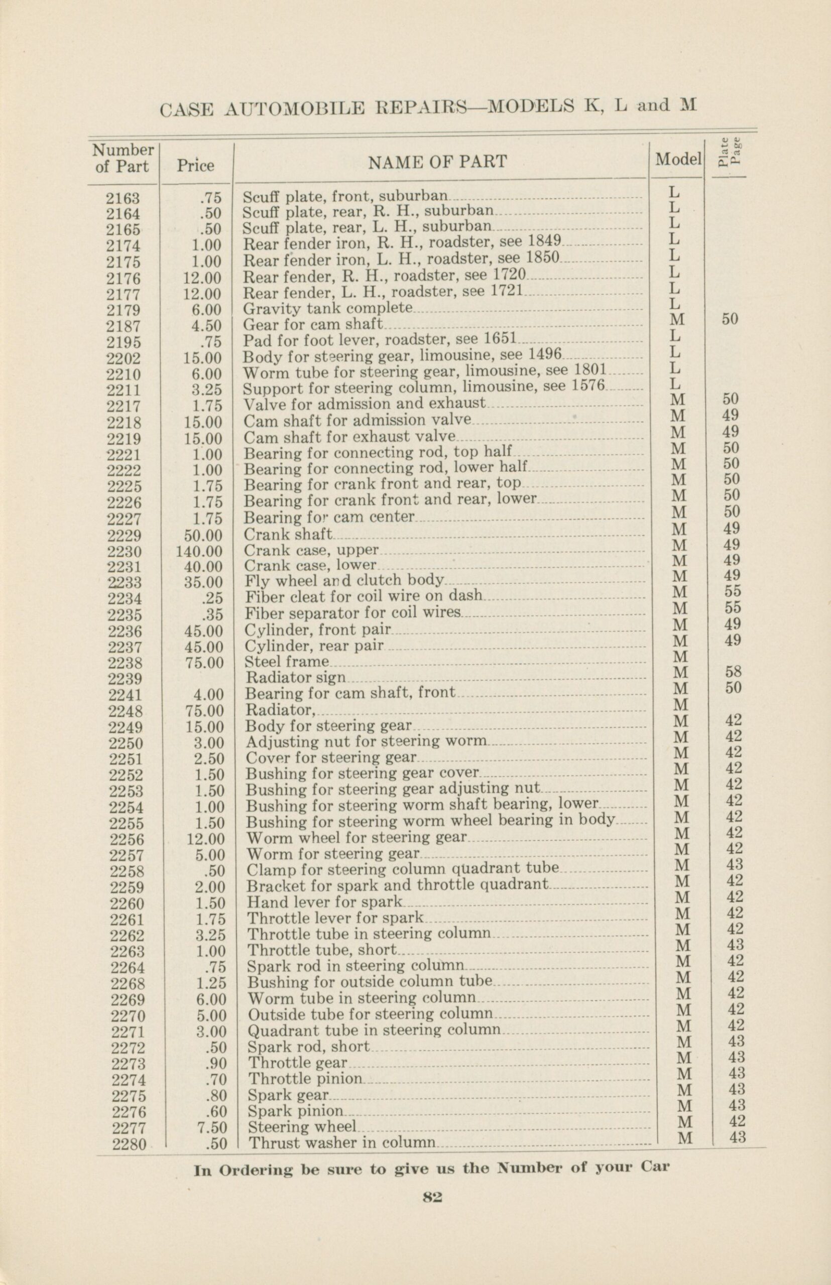 1912 CASE AUTOMOBILE REPAIR Price List Models K-30, L-30, M-40 page 82