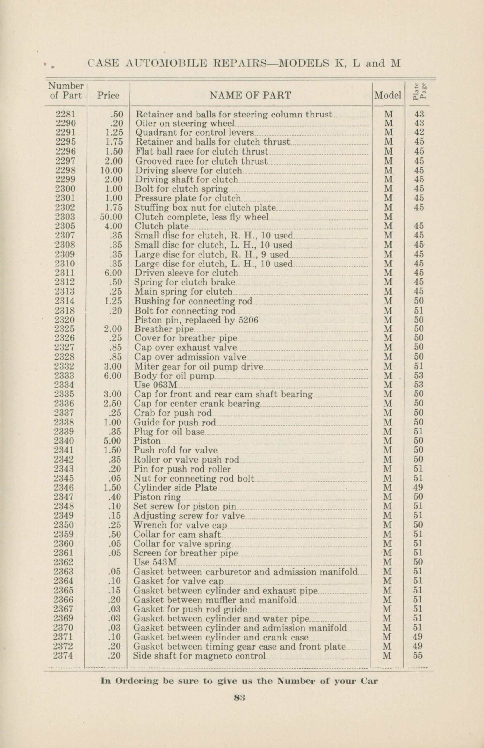 1912 CASE AUTOMOBILE REPAIR Price List Models K-30, L-30, M-40 page 83