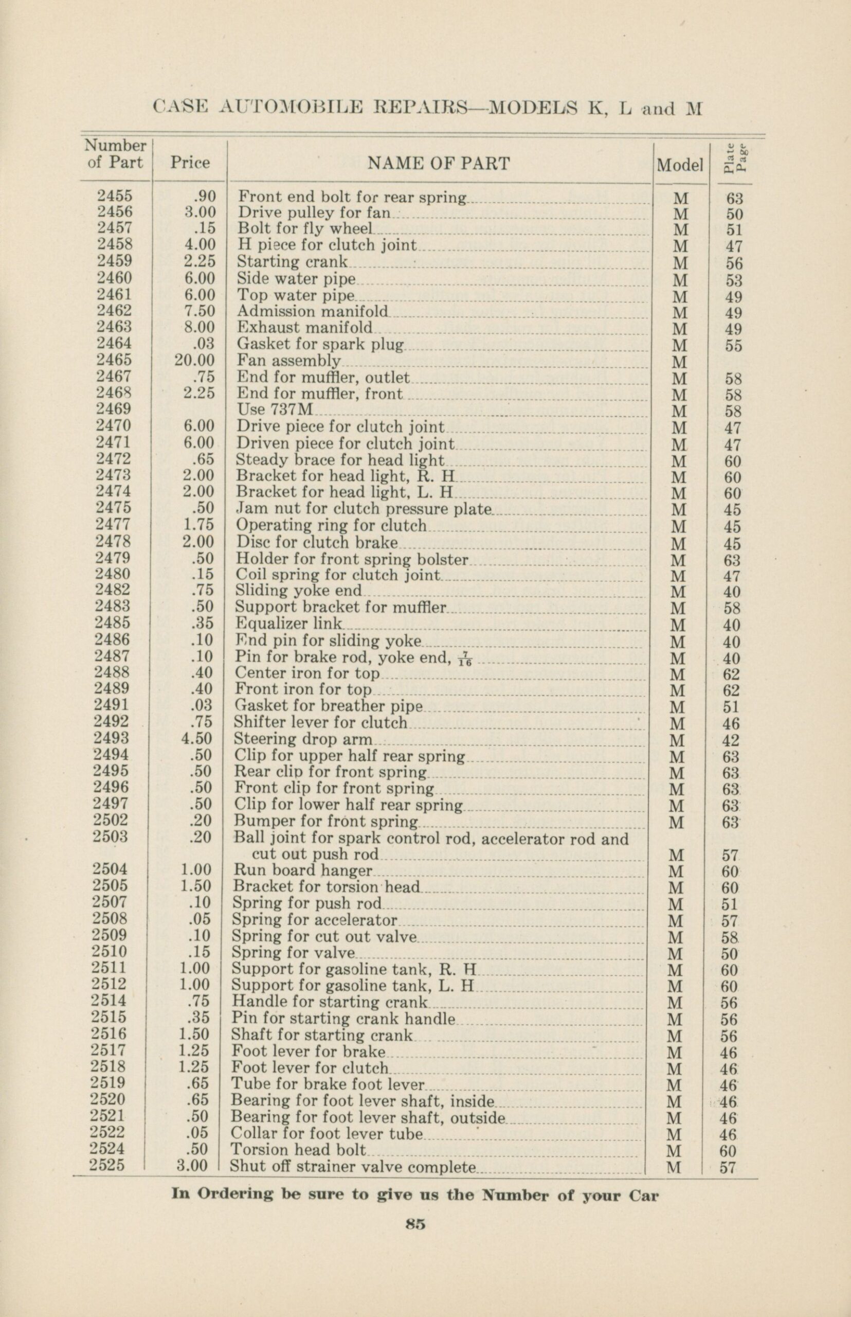 1912 CASE AUTOMOBILE REPAIR Price List Models K-30, L-30, M-40 page 85