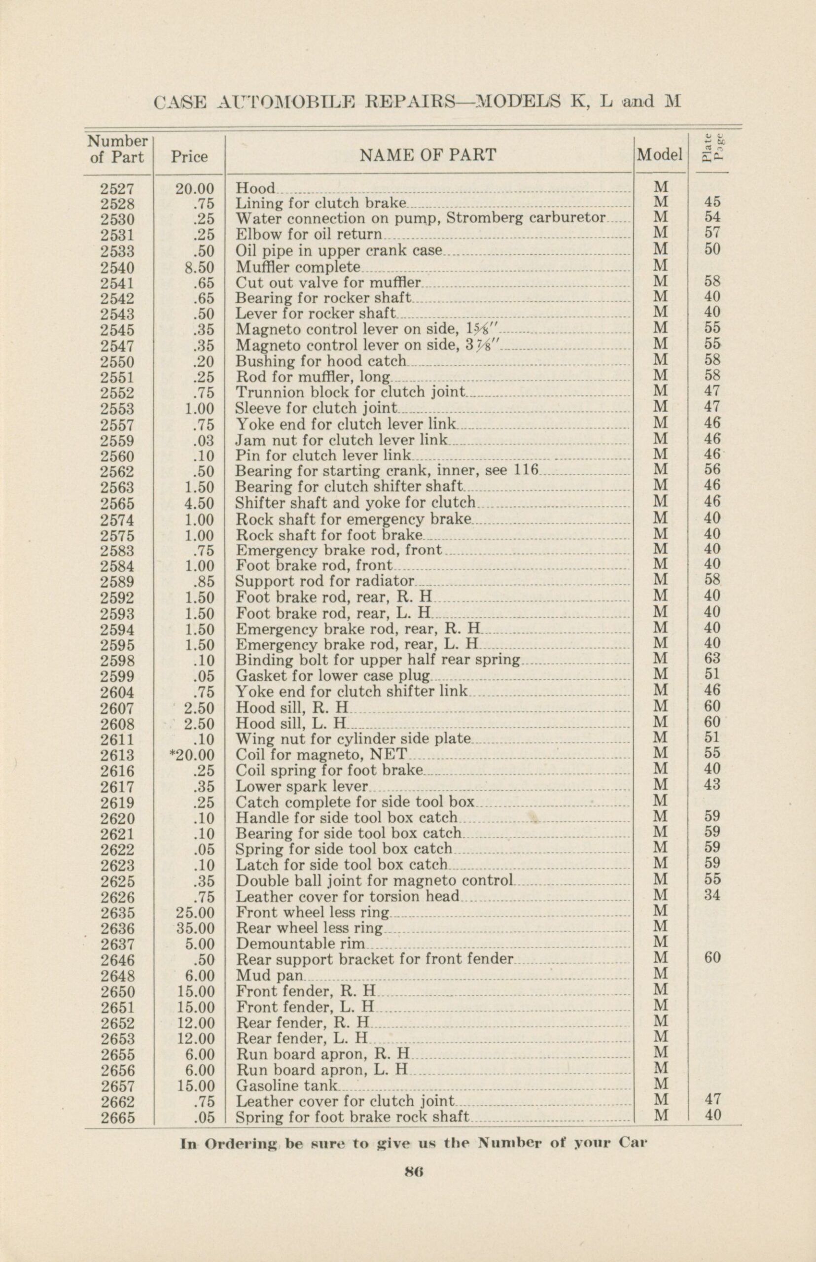 1912 CASE AUTOMOBILE REPAIR Price List Models K-30, L-30, M-40 page 86
