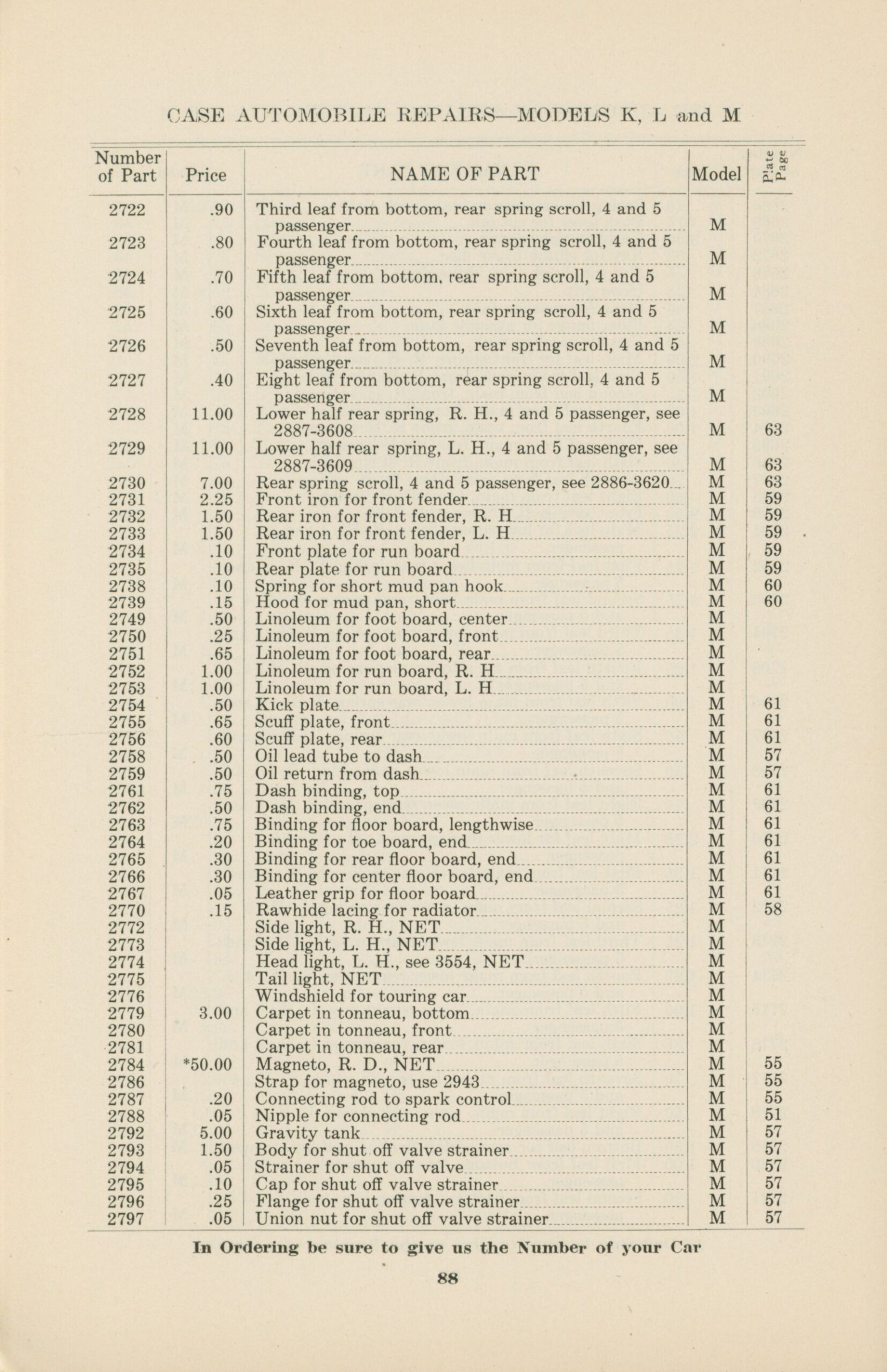 1912 CASE AUTOMOBILE REPAIR Price List Models K-30, L-30, M-40 page 88