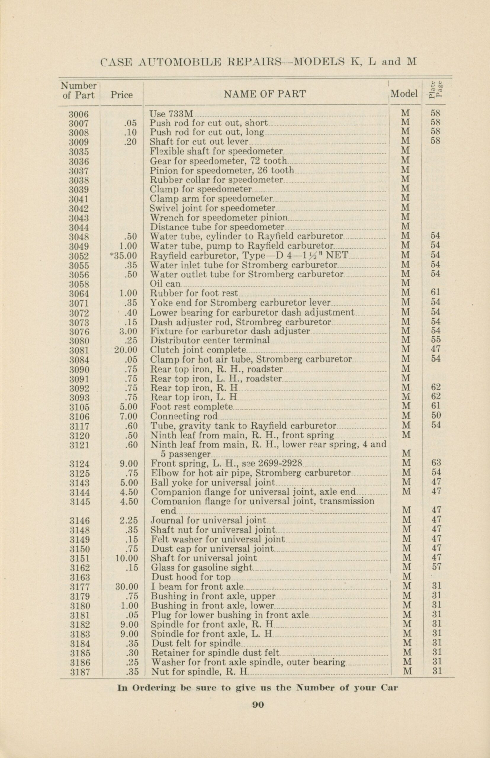 1912 CASE AUTOMOBILE REPAIR Price List Models K-30, L-30, M-40 page 90