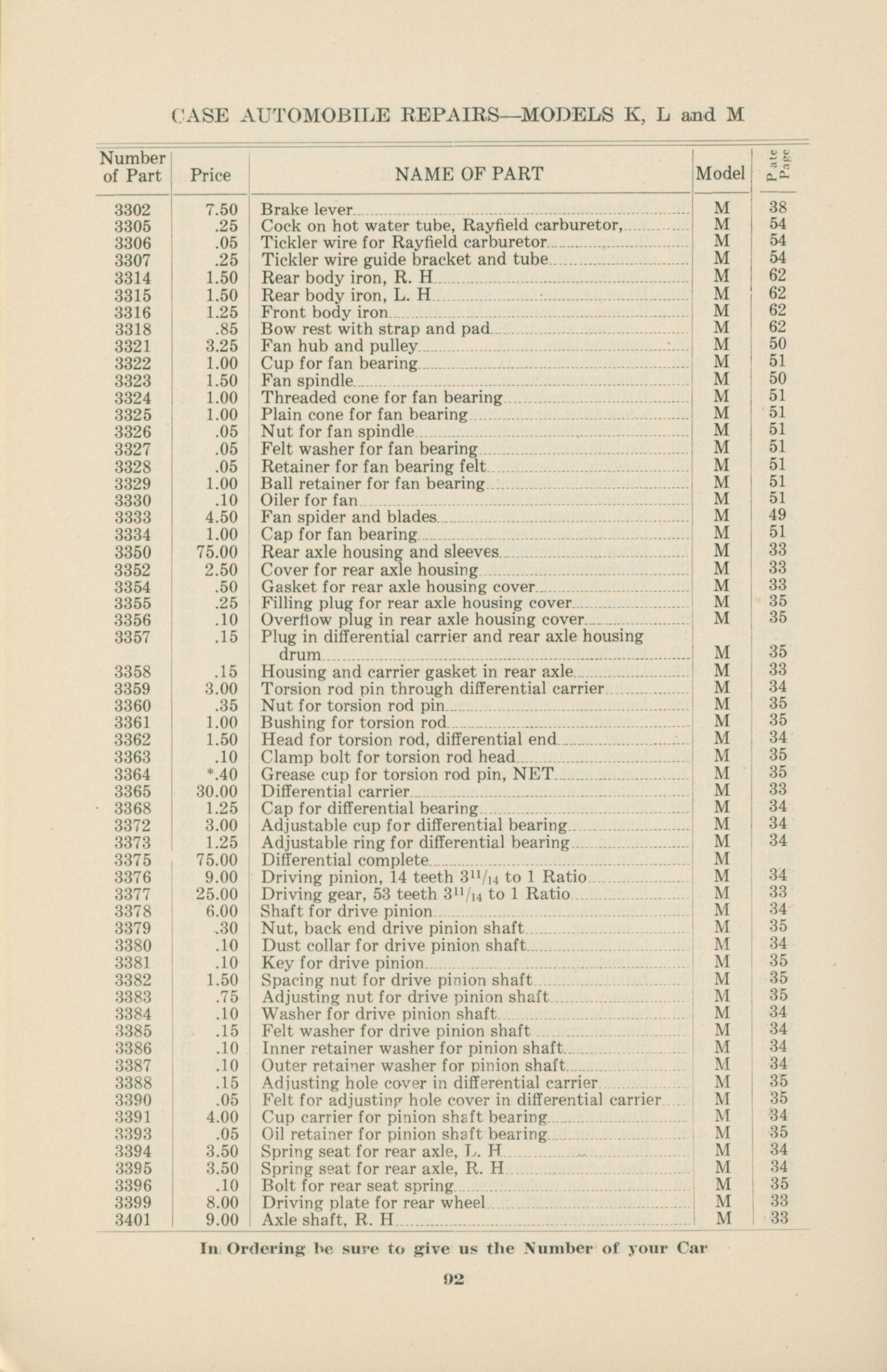 1912 CASE AUTOMOBILE REPAIR Price List Models K-30, L-30, M-40 page 92