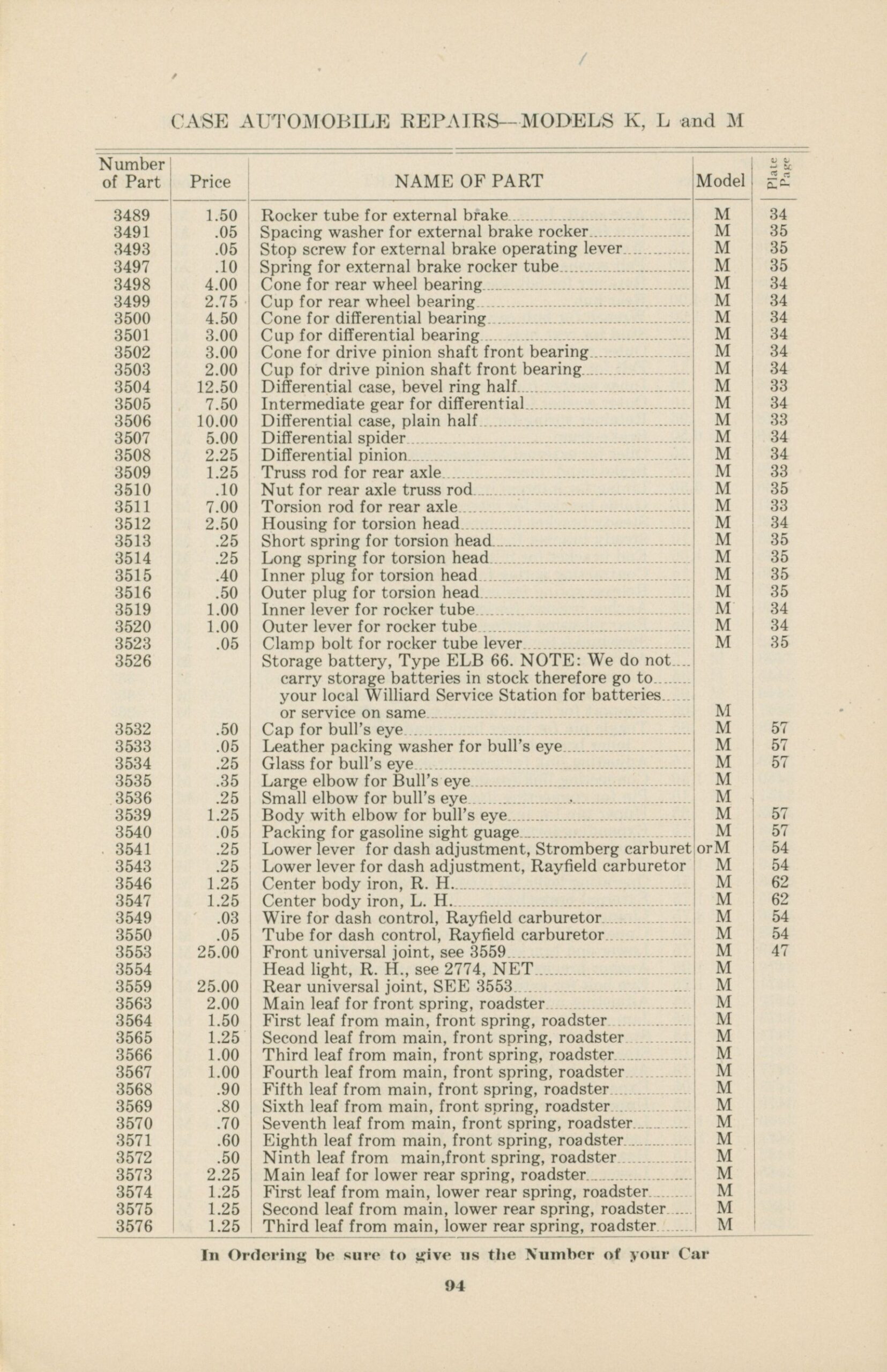1912 CASE AUTOMOBILE REPAIR Price List Models K-30, L-30, M-40 page 94