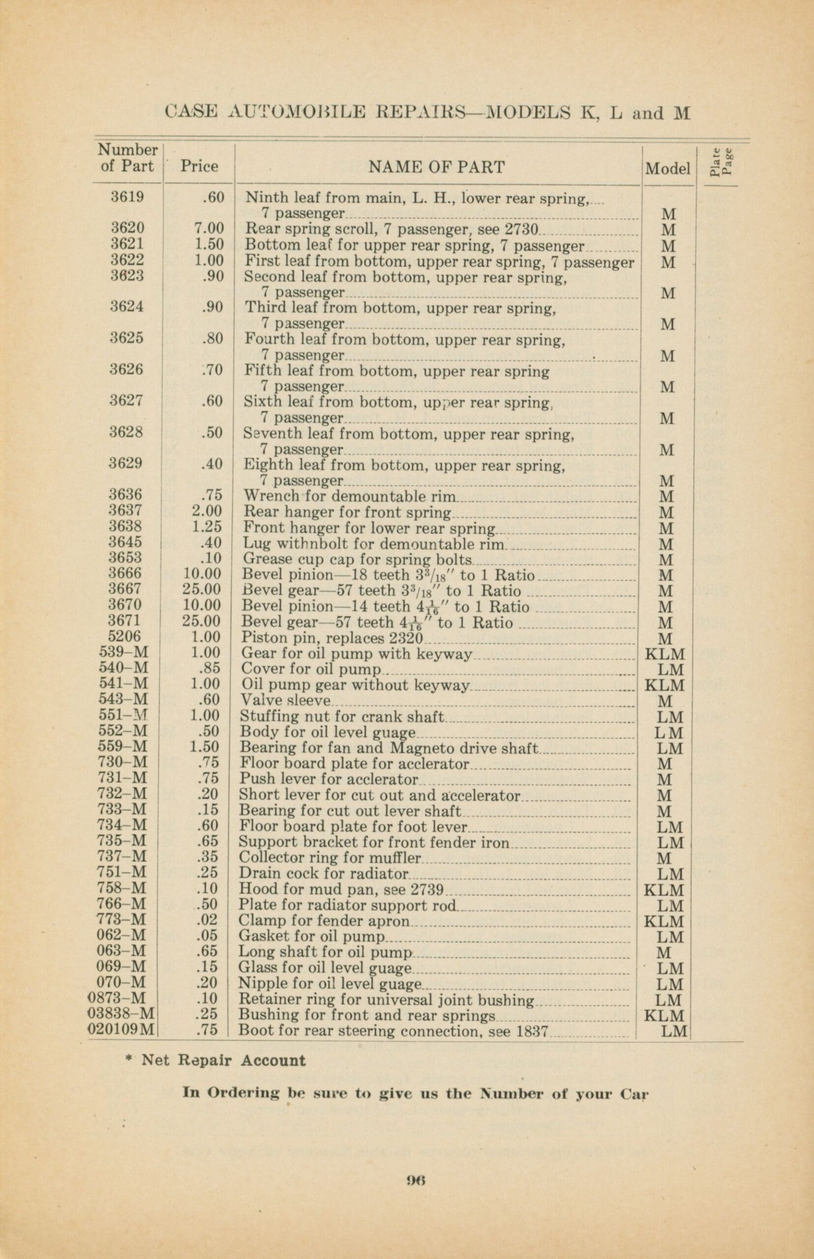 1912 CASE AUTOMOBILE REPAIR Price List Models K-30, L-30, M-40 page 96
