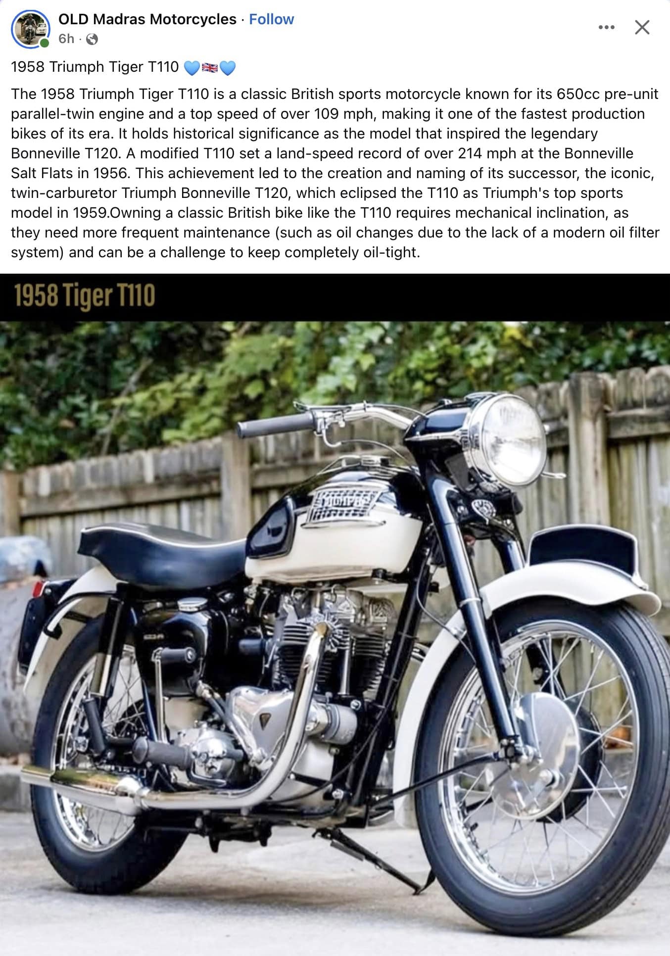 1958 TRIUMPH Tiger T110 motorcycle FB