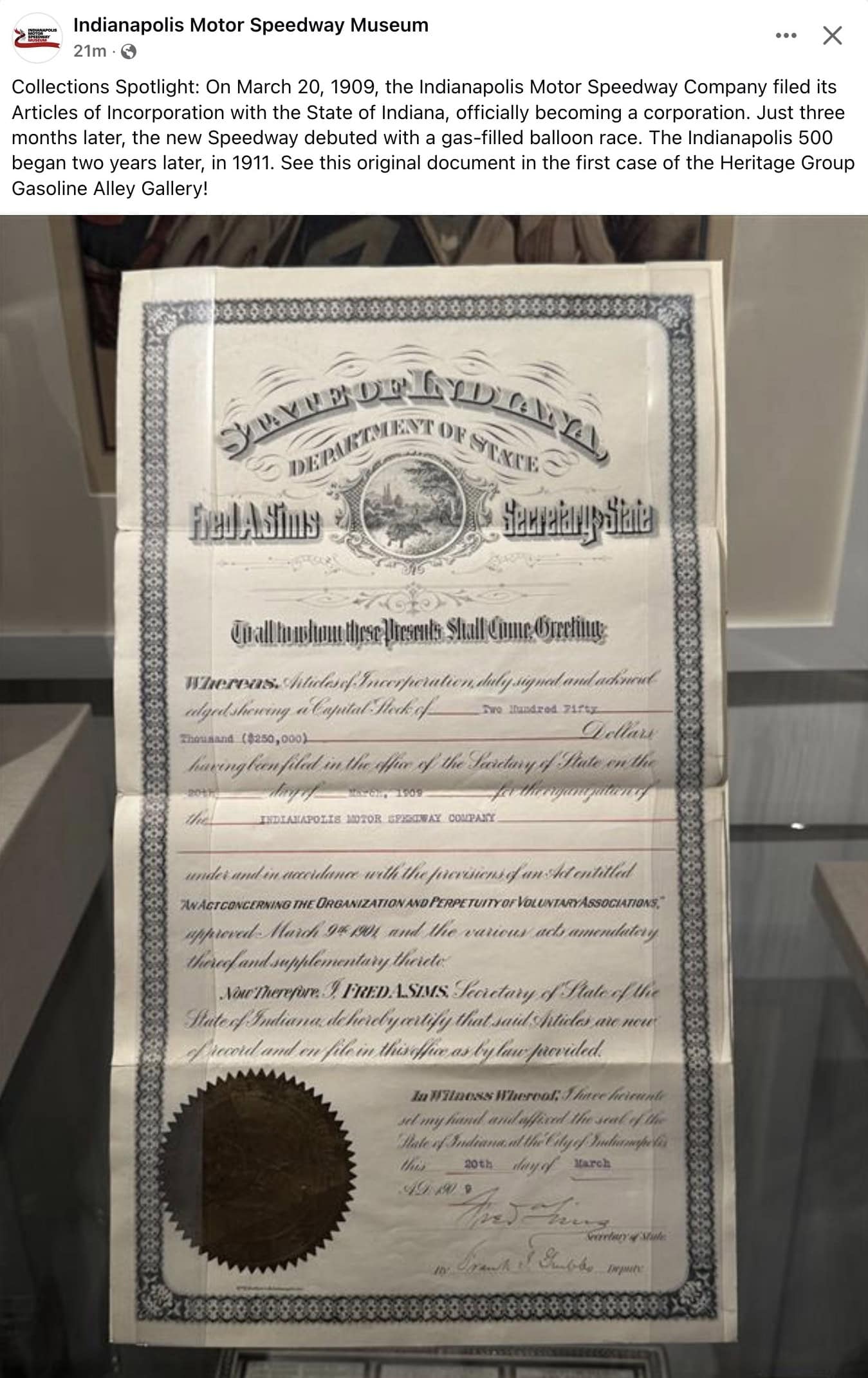 1909 3 20 Indy 500 Articles of Incorporation FB