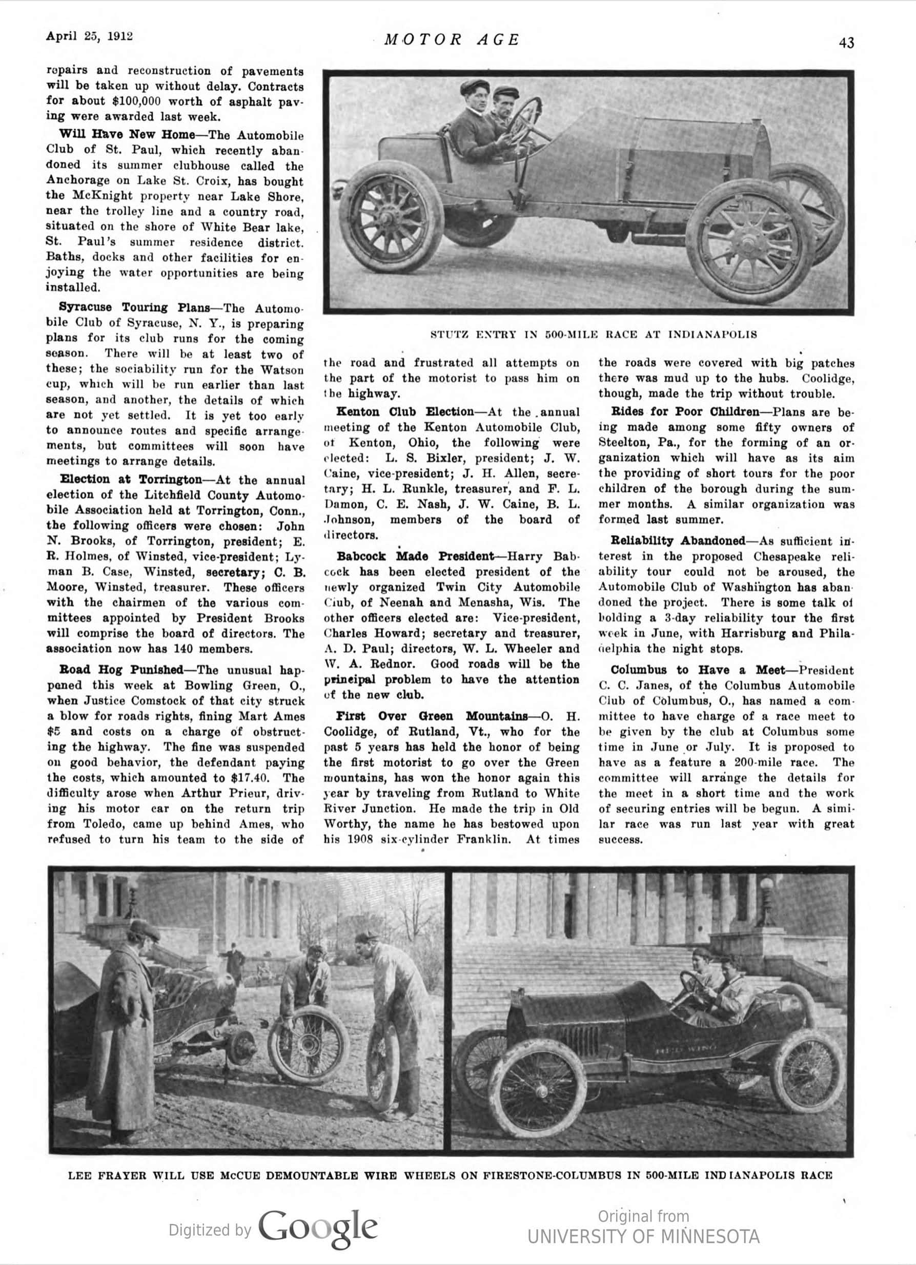 1912 4 25 STUTZ Entry In 500-Mile Race At Indianapolis photo MOTOR AGE page 43