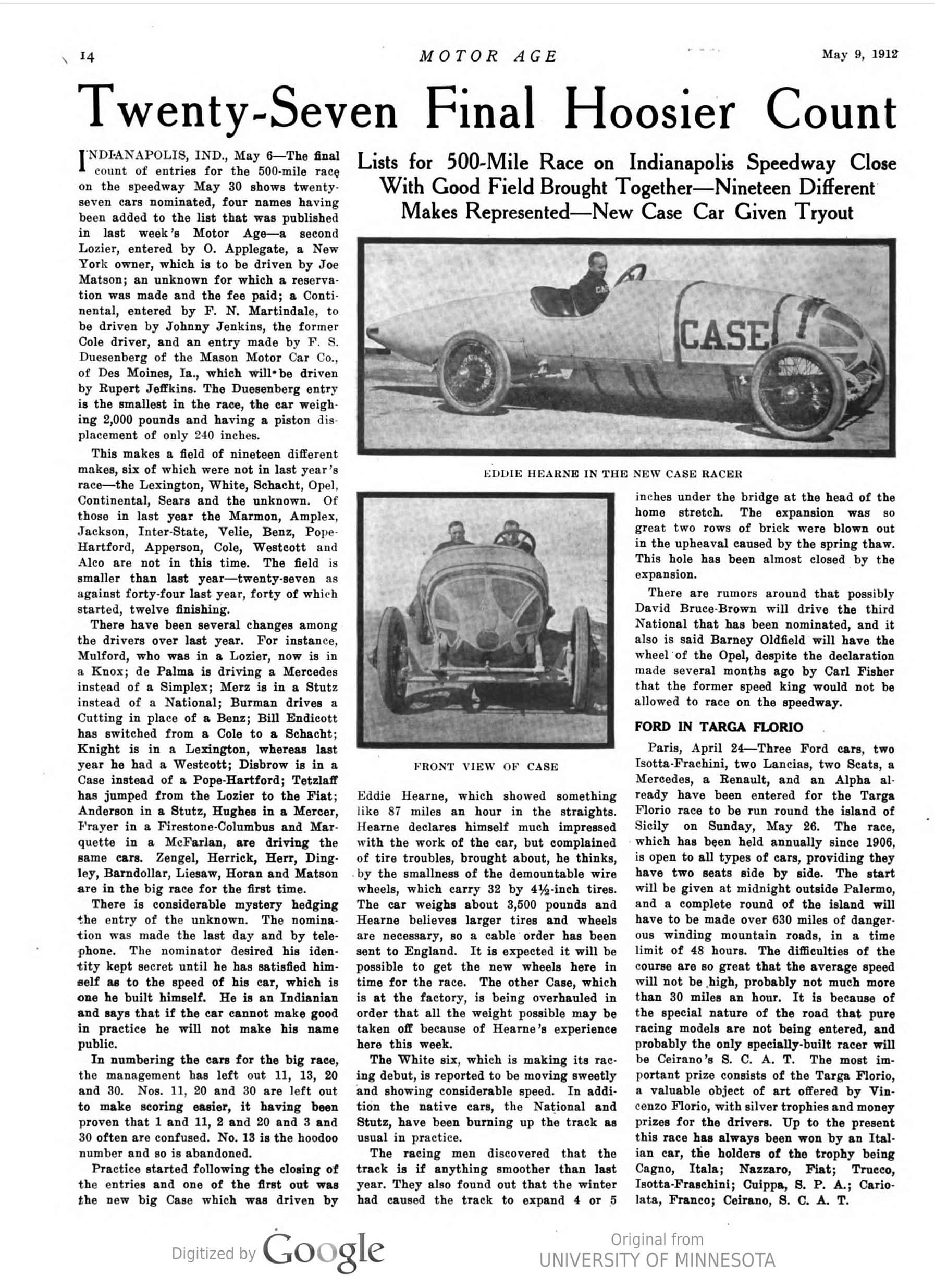 1912 5 9 Indy 500 CASE Twenty-Seven Final Hoosier Count article MOTOR AGE Google page 14