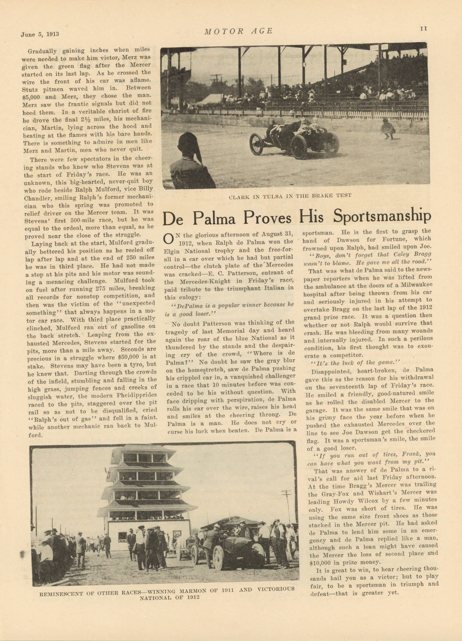 1913 6 5 Indy 500 Champagne Castor Oil and Gasoline By J.C. Burton article MOTOR AGE 8.5″×11.75″ page 11
