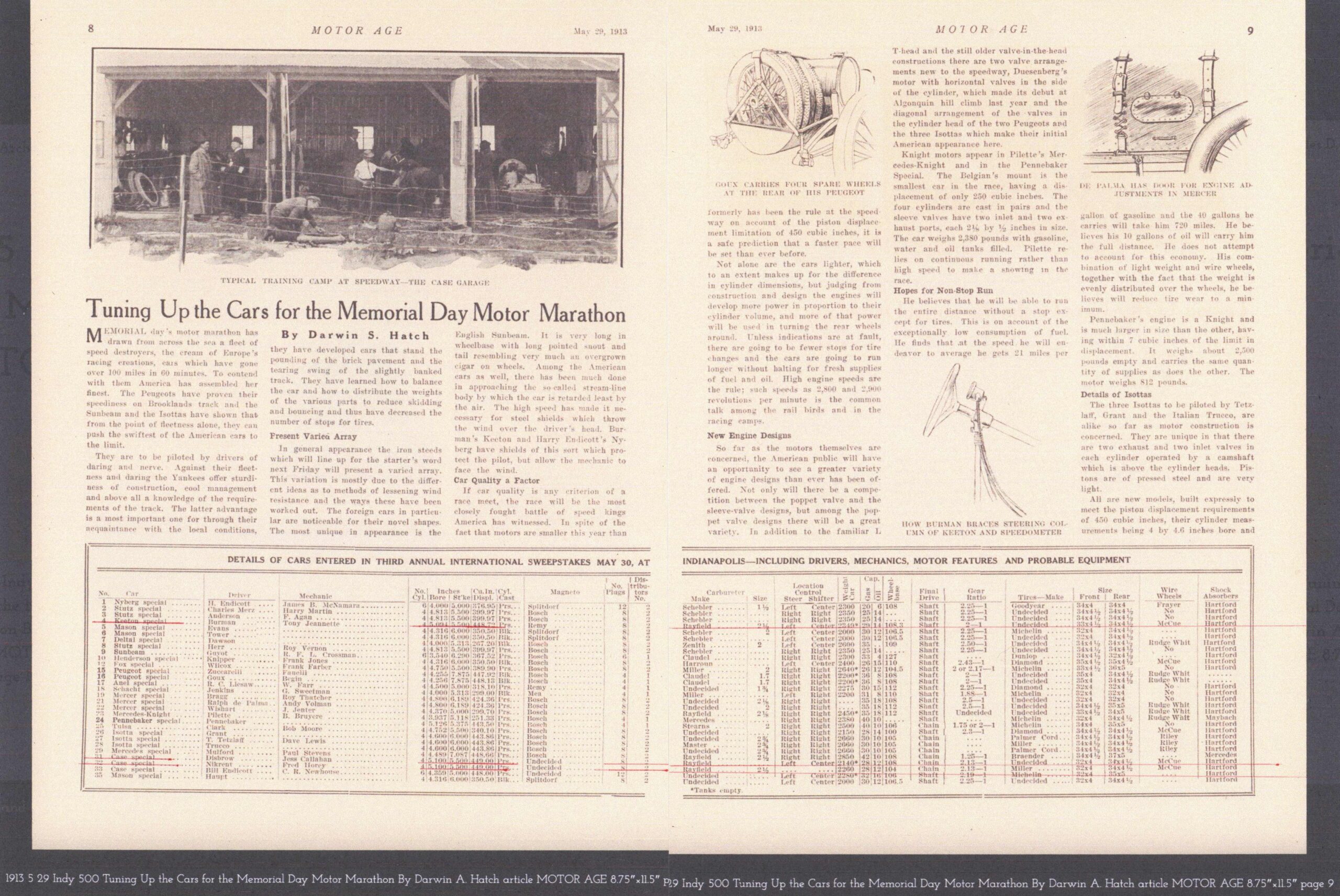 1913 5 29 Indy 500 KEETON Tuning Up the Cars for Memorial Day Motor Marathon MOTOR AGE pages 8.5″x12″ 8 & 9